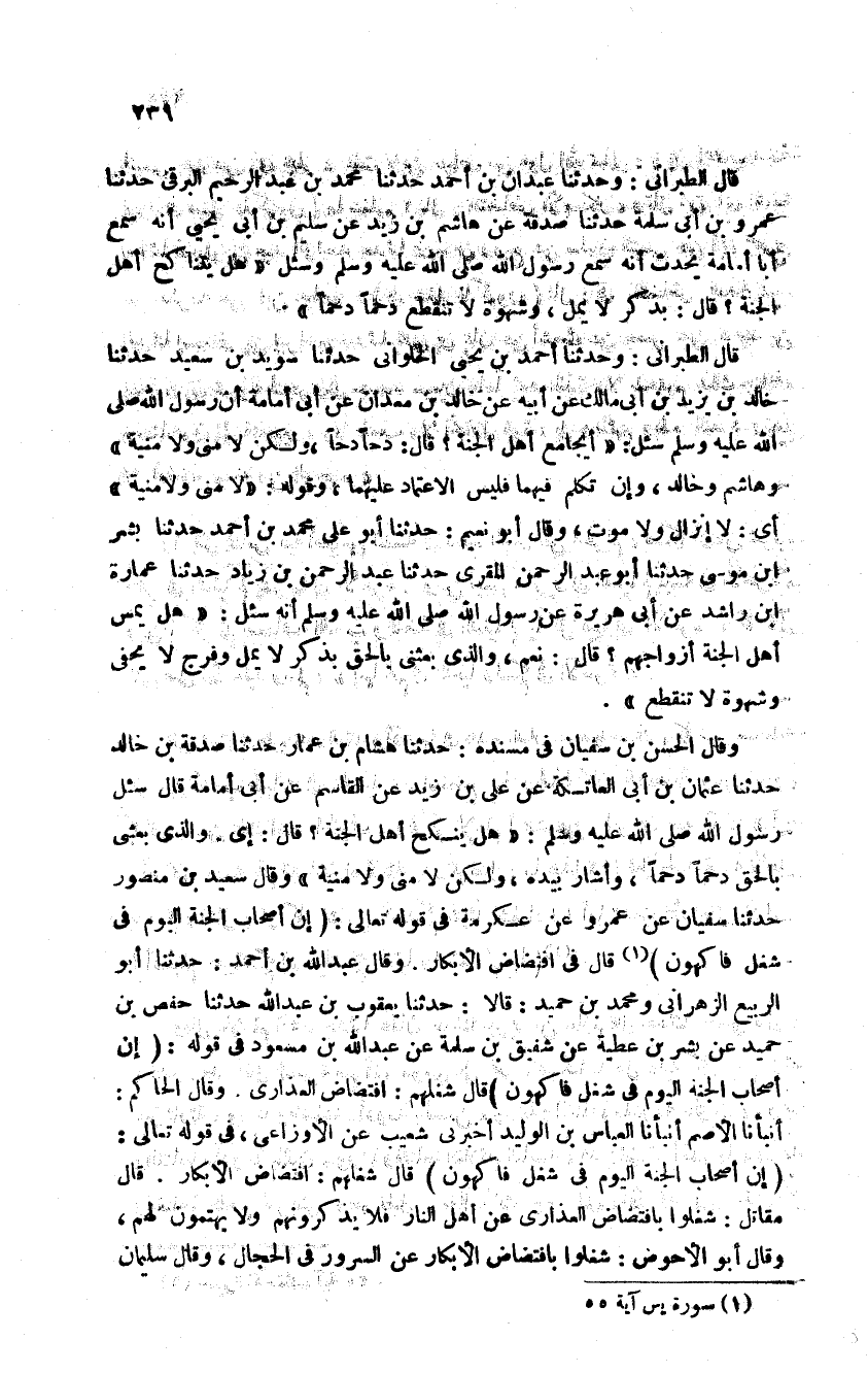 قال الطبراني وحدثنا احمد بن يحيى الحلواني حدثنا سويد بن سعيد حدثنا خالد بن يزيد بن أبي مالك عن أبيه عن خالد بن معدان عن أبي أمامة أن رسول الله صلى الله عليه وسلم سئل: أيجامع أهل الجنة قال: "دحا دحا ولكن لا مني ولا منية" وهاشم وخالد وأن تكلم فيهما فليس الاعتماد عليهما وقوله: لا منى ولا منية أي لا إنزال ولا موت وقال أبو نعيم حدثنا أبو على محمد بن احمد حدثنا بشر بن موسى حدثنا أبو عبد الرحمن المقريء حدثنا عبد الحمن بن زياد حدثنا عمارة بن راشد عن أبي هريرة رضي الله عنه عن رسول الله أنه سئل هل يمس أهل الجنة أزواجهم قال: "نعم والذي بعثني بالحق بذكر لا يمل وفرج لا يحفى وشهوة لا تنقطع"