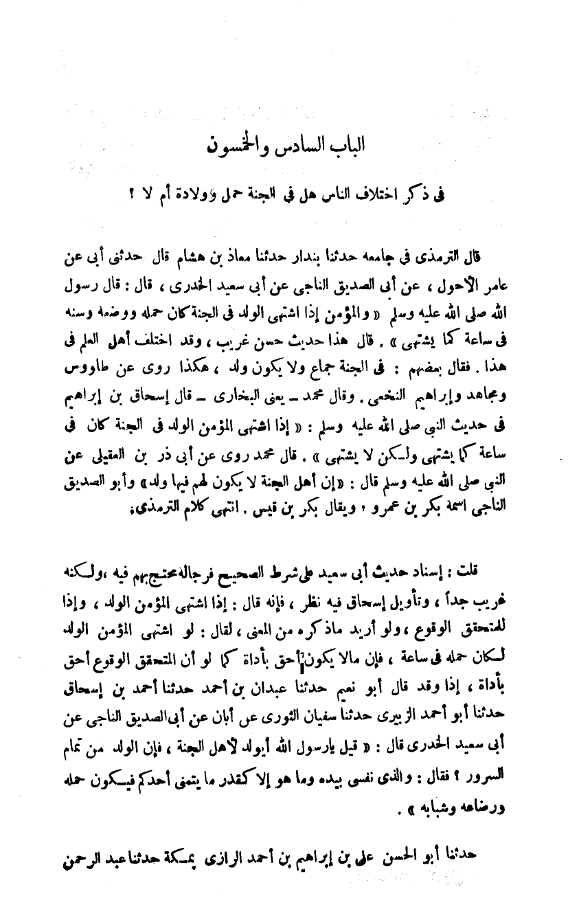 قال الترمذي في جامعه حدثنا بندار حدثنا معاذ بن هشام قال حدثني أبي عن عامر الأحول عن أبي الصديق الناجي عن أبي سعيد الخدري قال قال رسول الله صلى الله عليه وسلم: "المؤمن إذا اشتهى الولد في الجنة كان حمله ووضعه وسنه في ساعة كما يشتهي" قال هذا حديث حسن غريب وقد اختلف أهل العلم في هذا فقال بعضهم في الجنة جماع ولا يكون ولد هكذا روى عن طاووس ومجاهد وإبراهيم النخعي وقال محمد -يعني البخاري- قال اسحاق بن إبراهيم في حديث النبي صلى الله عليه وسلم إذا اشتهى المؤمن الولد في الجنة كان في ساعة كما يشتهي ولكن لا يشتهي قال محمد وقد روى عن أبي ذر بن العقيلي عن النبي صلى الله عليه وسلم قال: "إن أهل الجنة لا يكون لهم فيها ولد" وأبو الصديق الناجي اسمه بكر بن عمرو ويقال بكر بن قيس انتهى كلام الترمذي