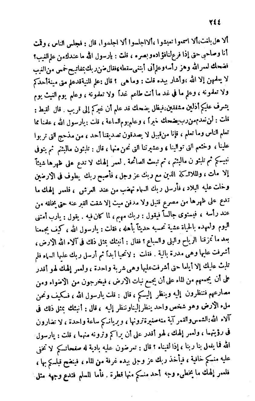 ألا هل بلغت ألا اسمعوا تعيشوا ألا اجلسوا ألا اجلسوا قال: فجلس الناس وقمت أنا وصاحبي حتى إذا فرغ لنا فؤاده وبصره قلت: يا رسول الله صلى الله عليه وسلم ما عندك من علم الغيب فضحك لعمر الله وهز رأسه وعلم أني ابتغي سقطه فقال: "ضن ربك بمفاتيح خمس من الغيب لا يعلمهن إلا الله وأشار بيده" قلت: وما هي قال: "علم المنية قد علم متى منية أحدكم ولا تعلمونه وعلم ما في غد ما أنت طاعم غدا ولا تعلمونه وعلم يوم الغيث يوم يشرف عليكم أذلين مشفقين فيظل يضحك قد علم أن غيركم إلى القريب قال لقيط: قلت: لن نعدم من رب يضحك خيرا وعلم يوم الساعة" قلت يا رسول الله صلى الله عليه وسلم: علمنا مما تعلم الناس وما تعلم فإنا من قبيل لا يصدقون تصديقنا أحد من مذحج التي تربوا علينا وخثعم التي توالينا وعشيرتنا التي نحن منها قال: "تلبثون ما لبثتم ثم يتوفى نبيكم ثم تلبثون ما لبثتم ثم تبعث الصائحة لعمر إلهك لا تدع على ظهرها شيئا إلا مات والملائكة الذين مع ربك عز وجل فأصبح ربك يطوف في الأرضيين وخلت عليه البلاد فأرسل ربك السماء تهضب من عند العرش فلعمر إلهك ما تدع على ظهرها من مصرع قتيل ولا مدفن ميت إلا شقت القبر عنه حتى يخلقه من عند رأسه فيستوي جالسا فيقول ربك مهيم لما كان فيه يقول يا رب امتني اليوم ولعهده بالحياة عشية تحسبه حديثنا بأهله فقلت: يا رسول الله صلى الله عليه وسلم كيف يجمعنا بعدما تمزقنا الرياح والبلى والسباع فقال: "أنبئك بمثل ذلك في آلاء الله الأرض أشرفت عليها وهي مدرة بالية" فقلت: لا تحيا أبدا ثم أرسل ربك عليها السماء فلم تبلث عليك إلا أياما حتى أشرفت عليها وهي شربة واحدة ولعمر إلهك لهو اقدر على أن يجمعهم من الماء على أن يجمع نبات الأرض فيخرجون من الأضواء ومن مصارعهم فتنظرون إليه وينظر إليكم قال قلت: يا رسول الله صلى الله عليه وسلم فكيف ونحن ملء الأرض وهو شخص واحد ينظر إلينا وننظر إليه قال: "أنبئك بمثل ذلك في آلاء الله الشمس والقمر آية منه صغيرة ترونها ويريانكم ساعة واحدة لا تضارون في رؤيتهما ولعمر إلهك لهو أقدر على أن يراكم وترونه منها" قلت: يا رسول الله صلى الله عليه وسلم فما يفعل بنا ربنا إذا لقيناه قال تعرضون عليه بادية له صفحاتكم لا تخفى عليه منكم خافية فيأخذ ربك عز وجل بيده غرفة من ماء فينضح قبلكم بها فلعمر إلهك ما يخطئ وجه احد منكم منها قطرة فأما المسلم فتدع وجهه مثل