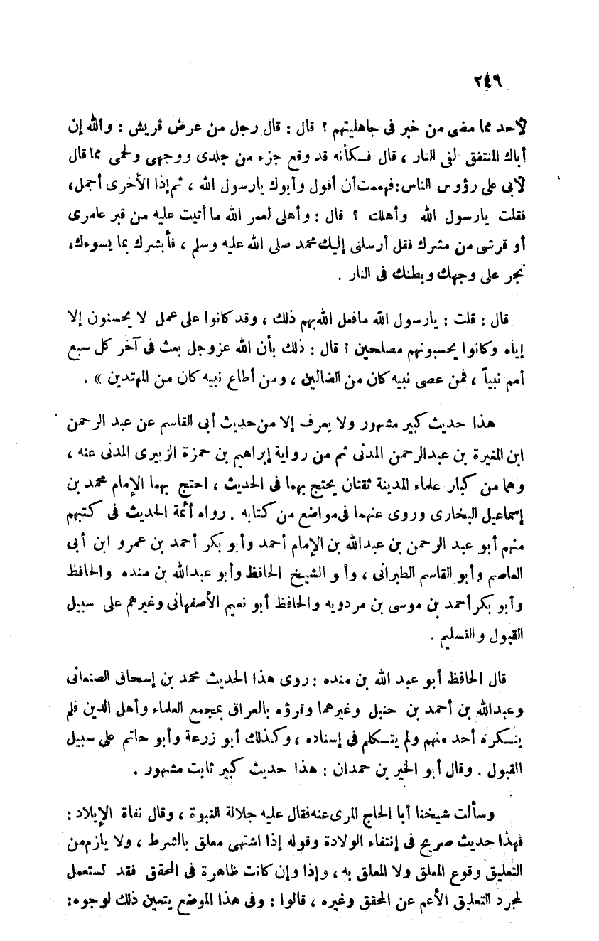 لأحد مما مضى من خبر في جاهليتهم قال قال: "رجل من عرض قريش والله إن أباك المنتفق لفي النار قال فلكأنه قد وقع جزء من جلدي ووجهي ولحمي مما قال لأبي على رؤوس الناس فهممت أن أقول وأبوك يا رسول الله صلى الله عليه وسلم ثم إذا الأخرى أجمل فقلت يا رسول الله صلى الله عليه وسلم وأهلك قال وأهلي لعمر الله ما أتيت عليه من قبر عامري أو قرشي من مشرك فقل أرسلني إليك محمد فأبشرك بما يسوءك تجر على وجهكم وبطنك في النار"
