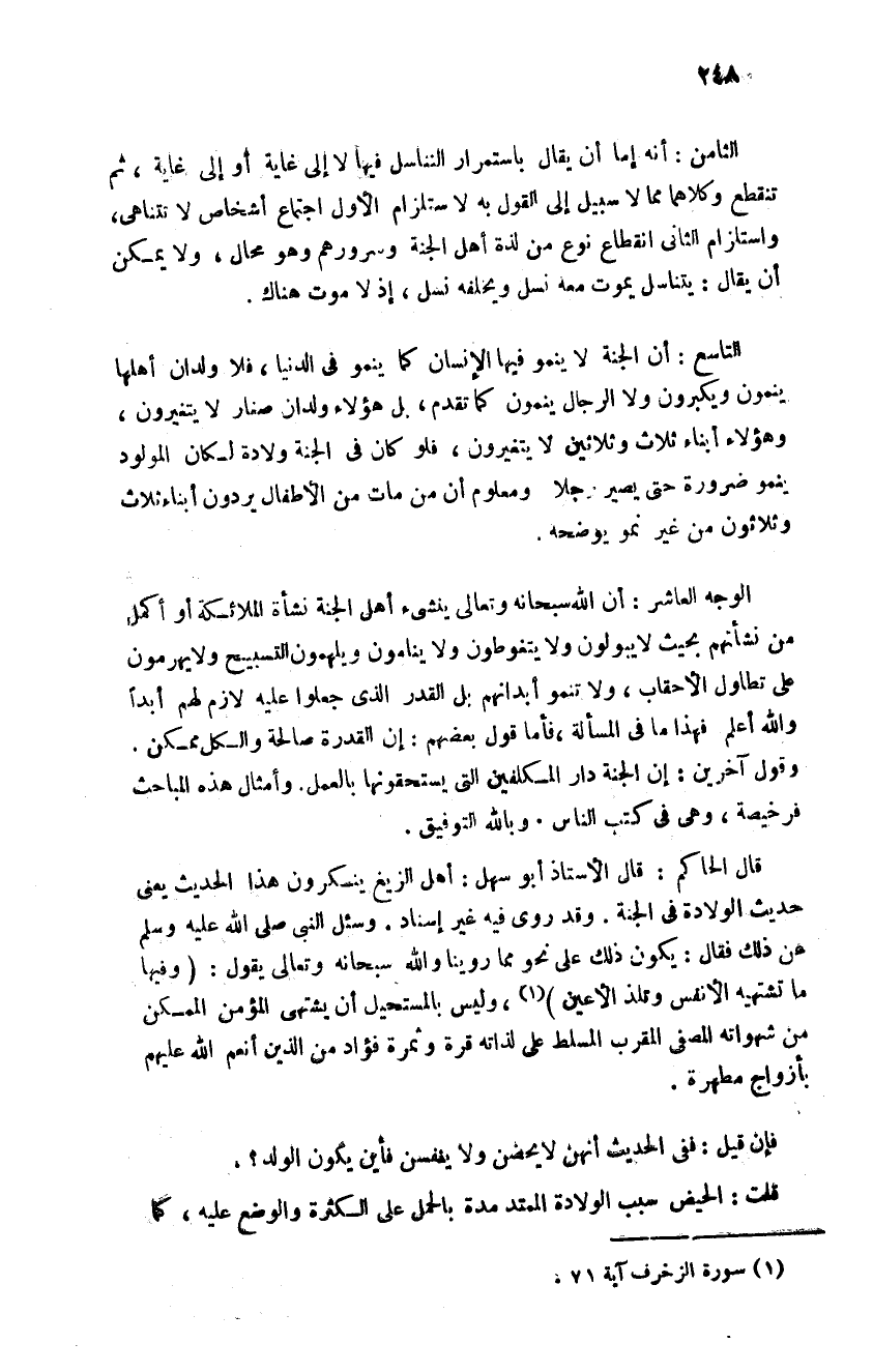 الثامن أنه أما أن يقال باستمرار التناسل فيها لا إلى غاية أو إلى غاية ثم تنقطع وكلاهما مما لا سبيل إلى القول به لاستلزام الأول اجتماع أشخاص لا تتناهى واستلزام الثاني انقطاع نوع من لذة أهل الجنة وسرورهم وهو محال ولا يمكن أن يقال بتناسل بموت معه نسل ويخلفه نسل إذ لا موت هناك