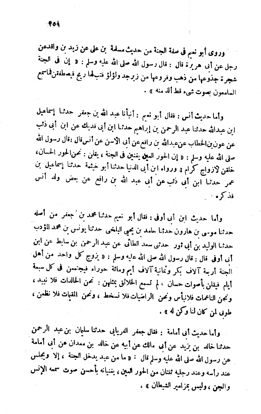 وأما حديث ابن أبي أوفى فقال أبو نعيم حدثنا محمد بن جعفر من أصله حدثنا موسى بن هارون حدثنا حامد بن يحيى البلخي حدثنا يونس بن محمد المؤدب حدثنا الوليد بن أبي ثور وحدثني سعد الطائي عن عبد الرحمن بن سابط عن ابن أبي أوفى قال قال رسول الله صلى الله عليه وسلم: "يزوج كل واحد من أهل الجنة أربعة آلاف بكر وثمانية آلاف أيم ومائة حوراء فيجتمعن في كل سبعة أيام فيقلن بأصوات حسان لم تسمع الخلائق بمثلهن نحن الخالدات فلا نبيد ونحن الناعمات فلا نبأس ونحن الراضيات فلا نسخط ونحن المقيمات فلا نظعن طوبى لمن كان لنا وكنا له ".