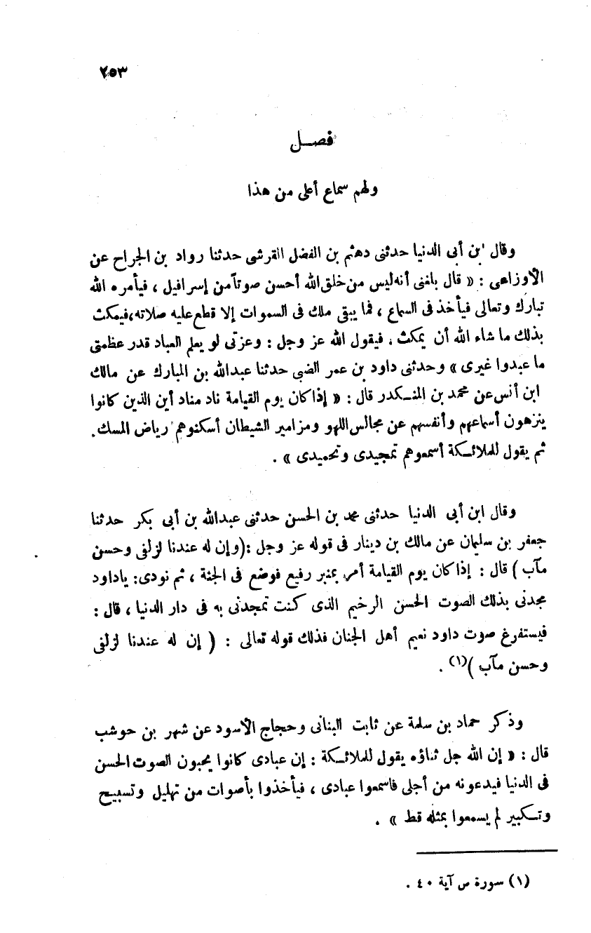 وذكر حماد بن سلمة عن ثابت البناني وحجاج الأسود عن شهر بن حوشب قال إن الله جل ثناؤه يقول للملائكة: "إن عبادي كانوا يحبون الصوت الحسن في الدنيا فيدعونه من اجلي فاسمعوا عبادي فيأخذوا بأصوات من تهليل وتسبيح وتكبير لم يسمعوا بمثله قط"