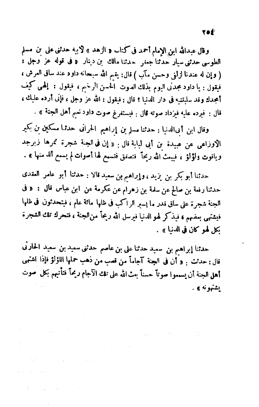 حدثنا إبراهيم بن سعيد حدثنا إبراهيم بن سعيد حدثنا علي بن عاصم حدثني سعيد بن سعيد الحارثي قال حدثت إن في الجنة آجاما من قصب من ذهب حملها اللؤلؤ فإذا اشتهى أهل الجنة يسمعوا صوتا حسنا بعث الله على تلك الآجام ريحا فتأتيهم بكل صوت يشتهونه"
