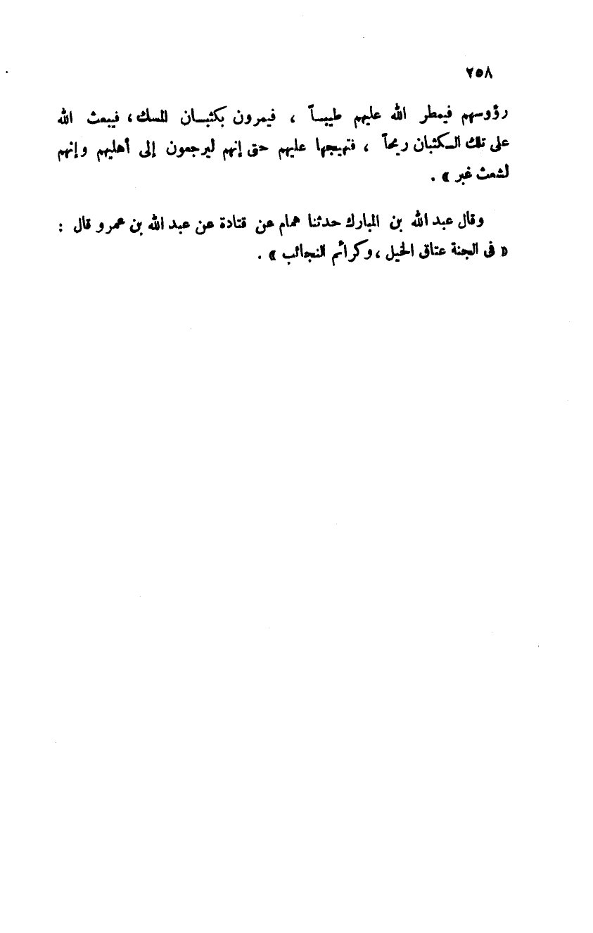 وقال عبد الله بن المبارك حدثنا همام عن قتادة عن عبد الله بن عمرو وقال: في الجنة عتاق الخيل وكرائم النجائب