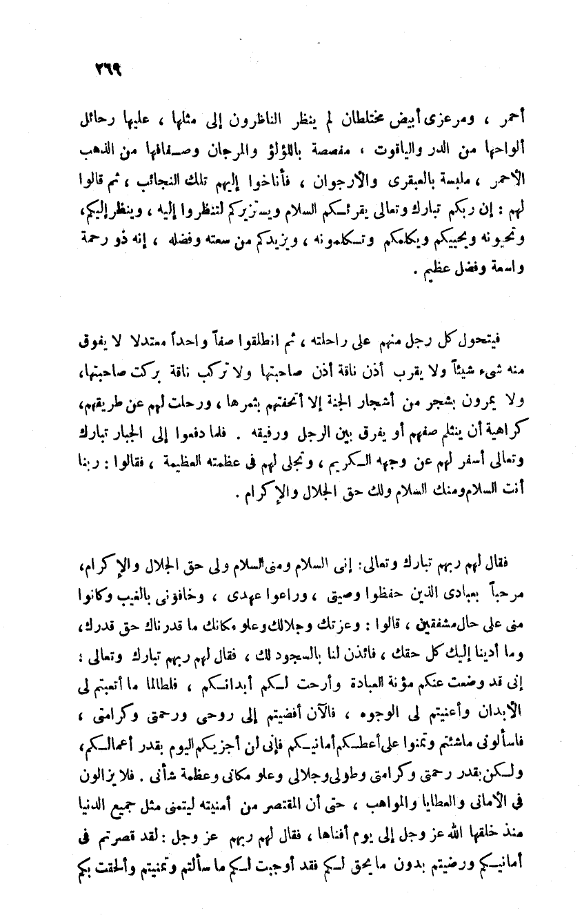 أحمر ومرزعي أبيض مختلطان لم ينظر الناظرون إلى مثلها عليها رجائل ألواحها من الدر والياقوت مفصصة باللؤلؤ والمرجان وصفافها من الذهب الأحمر ملبسة بالعبقري والأرجوان فأناخوا إليهم تلك النجائب ثم قالوا لهم إن ربكم تبارك وتعالى يقرئكم السلام ويستزيركم لتنظروا إليه وينظر إليكم وتحيونه ويحييكم ويكلمكم وتكلمونه ويزيدكم من سعته وفضله أنه ذو رحمة واسعة وفضل عظيم