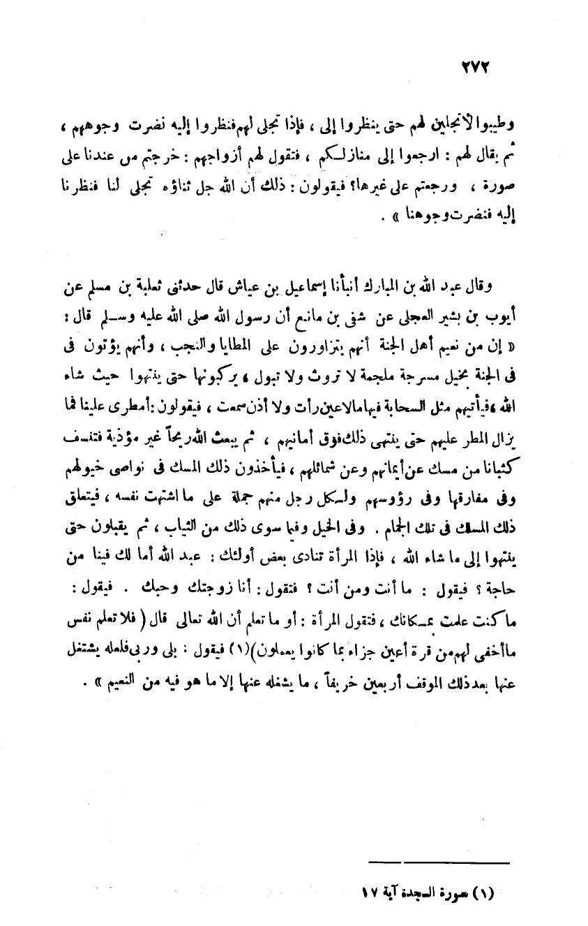 وقال عبد الله بن المبارك أنبانا إسماعيل بن عياش قال حدثني ثعلبة بن مسلم عن أيوب بن بشير العجلي عن شفي بن مانع أن رسول الله صلى الله عليه وسلم قال: إن من نعيم أهل الجنة أنهم يتزاورون على المطايا والنجب وأنهم يؤتون في الجنة بخيل مسرجة ملجمة لا تروث ولا تبول يركبونها حتى ينتهوا حيث شاء الله فيأتيهم مثل السحابة فيها ما لا عين رأت ولا أذن سمعت فيقولون أمطري علينا فما يزال المطر عليهم حتى ينتهي ذلك فوق أمانيهم ثم يبعث الله ريحا غير مؤذية فتنسف كثبانا من مسك عن إيمانهم وعن شمائلهم فيأخذون ذلك المسك في نواصي خيولهم وفي مفارقها وفي رؤوسهم ولكل رجل منهم جمة على ما اشتهت نفسه فيتعلق ذلك المسك في تلك الجمام وفي الخيل وفيما سوى ذلك من الثياب ثم يقبلون حتى ينتهوا إلى ما شاء الله من فإذا المرأة تنادي بعض أولئك يا عبد الله أما لك فينا من حاجة فيقول ما أنت ومن أنت فتقول أنا زوجتك وحبك فيقول ما كنت علمت بمكانك فتقول المرأة أو ما تعلم أن الله وتعالى قال: {فَلا تَعْلَمُ نَفْسٌ مَا أُخْفِيَ لَهُمْ مِنْ قُرَّةِ أَعْيُنٍ جَزَاءً بِمَا كَانُوا يَعْمَلُونَ} فيقول بلى وربي فلعله يشتغل عنها بعد ذلك الموقف أربعين خريفا ما يشغله عنها إلا ما هو فيه من النعيم"