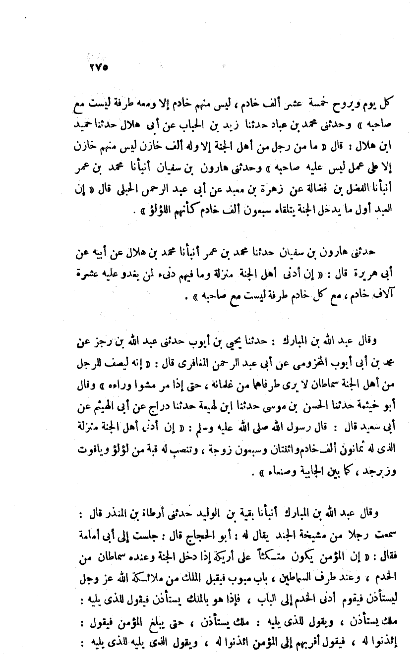 كل يوم ويروح خمسة عشر ألف خادم ليس منهم خادم إلا ومعه طرفة ليست مع صاحبه وحدثني محمد بن عباد حدثنا زيد بن الحباب عن أبي هلال حدثنا حميد بن هلال قال ما من رجل من أهل الجنة إلا وله ألف خازن ليس منهم خازن الأعلى عمل ليس عليه صاحبه وحدثني هارون بن سفيان أنبأنا محمد بن عمر أنبأنا الفضل بن فضالة عن زهرة بن معبد عن أبي عبد الرحمن الحبلى قال إن العبد أول ما يدخل الجنة يتلقاه سبعون ألف خادم كأنهم اللؤلؤ"