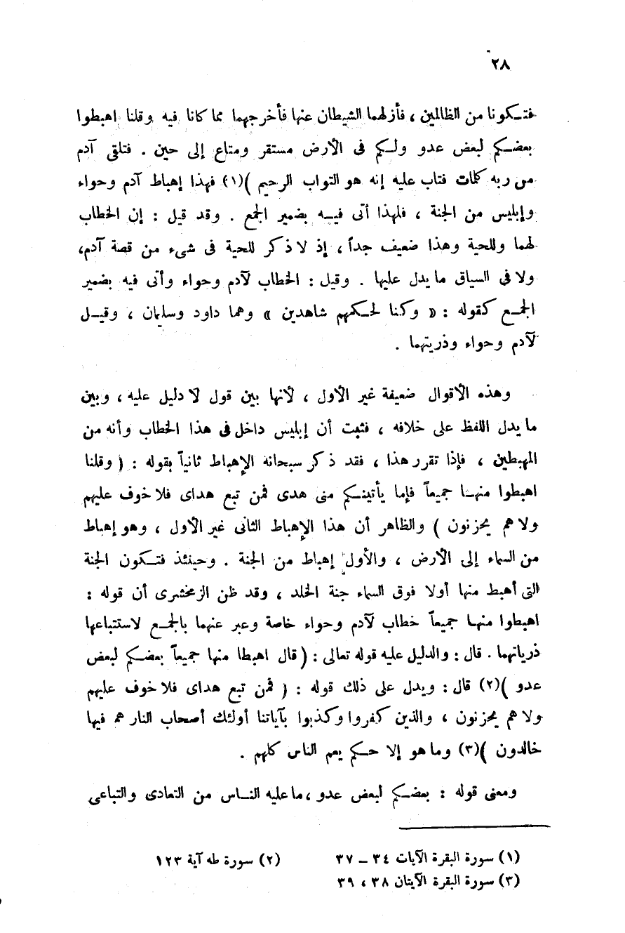 فَتَكُونَا مِنَ الظَّالِمِينَ فَأَزَلَّهُمَا الشَّيْطَانُ عَنْهَا فَأَخْرَجَهُمَا مِمَّا كَانَا فِيهِ وَقُلْنَا اهْبِطُوا بَعْضُكُمْ لِبَعْضٍ عَدُوٌّ وَلَكُمْ فِي الأَرْضِ مُسْتَقَرٌّ وَمَتَاعٌ إِلَى حِينٍ فَتَلَقَّى آدَمُ مِنْ رَبِّهِ كَلِمَاتٍ فَتَابَ عَلَيْهِ إِنَّهُ هُوَ التَّوَّابُ الرَّحِيمُ} فهذا إهباط آدم وحواء وإبليس من الجنة فلهذا أتى فيه بضمير الجمع وقد قيل إن الخطاب لهما وللحية وهذا ضعيف جدا إذ لا ذكر للحية في شيء من قصة آدم ولا في السياق ما يدل عليها وقيل الخطاب لآدم وحواء وأتى فيه بضمير الجمع كقوله وكنا لحكمهم شاهدين وهما داود وسليمان وقيل لآدم وحواء وذريتهما.