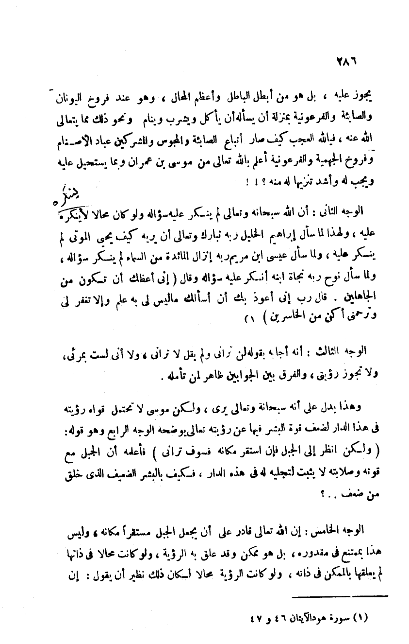 يجوز عليه بل ما هو من أبطل الباطل وأعظم المحال وهو عند فروخ اليونان والصابئة والفرعونية بمنزلة أن يسأله أن يأكل ويشرب وينام ونحو ذلك مما يتعالى الله عنه فيا لله العجب كيف صار أتباع الصابئة والمجوس والمشركين عباد الأصنام وفروخ الجهمية والفرعونية أعلم بالله تعالى من موسى بن عمران وبما يستحيل عليه ويجب له واشد تنزيها له منه الوجه الثاني إن الله سبحانه وتعالى لم ينكر عليه سؤاله ولو كان محالا لأنكره عليه ولهذا لما سال إبراهيم الخليل ربه تبارك وتعالى أن يريه كيف يحيي الموتى لم ينكر عليه ولما سأل عيسى بن مريم ربه إنزال المائدة من السماء لم ينكر عليه سؤاله ولما سأل نوح ربه نجاة ابنه أنكر عليه سؤاله وقال: {إِنِّي أَعِظُكَ أَنْ تَكُونَ مِنَ الْجَاهِلِينَ} قال رب إني أعوذ بك أن أسألك ما ليس لي به علم وإلا تغفر لي وترحمني اكن من الخاسرين الوجه الثالث أنه أجابه بقوله لن ترني ولم يقل لا تراني ولا إني لست بمرئي ولا تجوز رؤيتي والفرق بين الجوابين ظاهر لمن تأمله وهذا يدل على أنه سبحانه وتعالى يرى ولكن موسى لا تحتمل قواه رؤيته في هذه الدار لضعف قوة البشر فيها عن رؤيته تعالى يوضحه الوجه الرابع وهو قوله ولكن انظر إلى الجبل فإن استقر مكانه فسوف تراني فأعلمه ان الجبل مع قوته وصلابته لا يثبت لتجليه له في هذه الدار فكيف بالبشر الضعيف الذي خلق من ضعف الوجه الخامس إن الله سبحانه وتعالى قادر على أن يجعل الجبل مستقرا مكانه وليس هذا بممتنع في مقدوره بل هو ممكن وقد علق به الرؤية ولو كانت مجالا في ذاتها لم يعلقها بالممكن في ذاته ولو كانت الرؤيا محالا لكان ذلك نظير أن يقول: إن