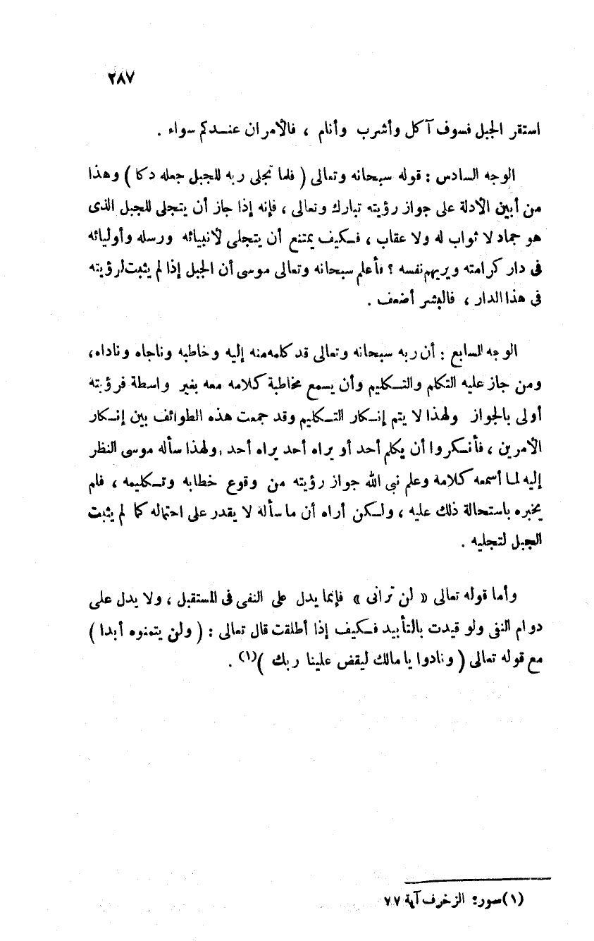 استقر الجبل فسوف آكل واشرب وأنام فالأمران عندكم سواء الوجه السادس قوله سبحانه وتعالى {فَلَمَّا تَجَلَّى رَبُّهُ لِلْجَبَلِ جَعَلَهُ دَكّاً} وهذا من أبين الأدلة على جواز رؤيته تبارك وتعالى فإنه إذا جاز أن يتجلى للجبل الذي هو جماد لا ثواب له ولا عقاب عليه فكيف يمتنع أن يتجلى لأنبيائه ورسله وأوليائه في دار كرامتهم ويريهم نفسه فأعلم سبحانه وتعالى موسى إن الجبل إذا لم يثبت لرؤيته في هذه الدار فالبشر اضعف الوجه السابع أن ربه سبحانه وتعالى قد كلمه منه إليه وخاطبه وناجاه وناداه ومن جاز عليه التكلم والتكليم وان يسمع مخاطبه كلامه معه بغير واسطة فرؤيته أولى بالجواز ولهذا لا يتم إنكار الرؤية إلا بإنكار التكليم وقد جمعت هذه الطوائف بين إنكار الأمرين فأنكروا أن يكلم أحدا أو يراه أحد ولهذا سأله موسى عليه السلام النظر إليه واسمعه كلامه وعلم نبي الله جواز رؤيته من وقوع خطا به وتكليمه لم يخبره باستحالة ذلك عليه ولكن أراه أن ما سأله لا يقدر على احتماله كما لم يثبت الجبل لتجليه وأما قوله تعالى: {لَنْ تَرَانِي} فإنما يدل على النفي في المستقبل ولا يدل على دوام النفي ولو قيدت بالتأبيد فكيف إذا أطلقت قال تعالى: {وَلَنْ يَتَمَنَّوْهُ أَبَداً} مع قوله تعالى: {وَنَادَوْا يَا مَالِكُ لِيَقْضِ عَلَيْنَا رَبُّكَ}