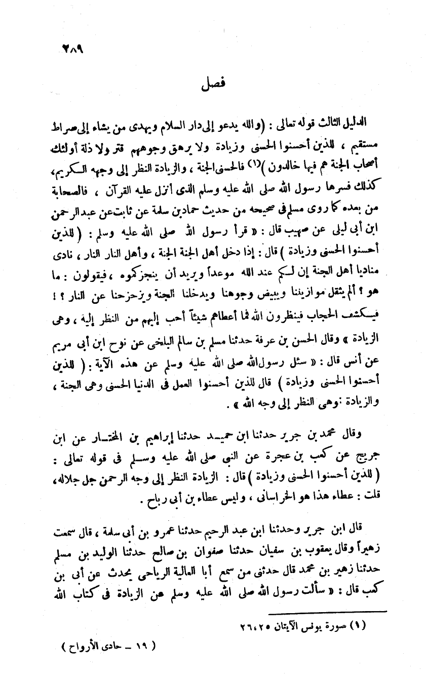 الدليل الثالث قوله تعالى: {وَاللَّهُ يَدْعُو إِلَى دَارِ السَّلامِ وَيَهْدِي مَنْ يَشَاءُ إِلَى صِرَاطٍ مُسْتَقِيمٍ لِلَّذِينَ أَحْسَنُوا الْحُسْنَى وَزِيَادَةٌ وَلا يَرْهَقُ وُجُوهَهُمْ قَتَرٌ وَلا ذِلَّةٌ أُولَئِكَ أَصْحَابُ الْجَنَّةِ هُمْ فِيهَا خَالِدُونَ} فالحسنى الجنة والزيادة النظر إلى وجهه الكريم كذلك فسرها رسول الله الذي انزل عليه القران فالصحابة من بعده كما روى مسلم في صحيحيه من حديث حماد بن سلمة عن ثابت عن عبد الرحمن بن أبي ليلى عن صهيب قال قرأ رسول الله صلى الله عليه وسلم: {لِلَّذِينَ أَحْسَنُوا الْحُسْنَى وَزِيَادَةٌ} قال إذا دخل أهل الجنة الجنة وأهل النار النار نادى مناد يا أهل الجنة إن لكم عند الله موعدا ويريد أن ينجزكموه فيقولون ما هو ألم يثقل موازيننا ويبيض وجوهنا ويدخلنا الجنة ويزحزحنا عن النار فيكشف الحجاب فينظرون الله فما أعطاهم شيئا أحب إليهم من النظر إليه وهي الزيادة وقال الحسن بن عرفة حدثنا مسلم بن سالم البلخي عن نوح بن أبي مريم عن ثابت عن أنس قال سئل رسول الله عن هذه الآية للذين أحسنوا الحسنى وزيادة قال للذين أحسنوا العمل في الدنيا الحسنى وهي الجنة والزيادة وهي النظر إلى وجه الله تعالى وقال محمد بن جرير حدثنا ابن حميد حدثنا إبراهيم بن المختار عن ابن جريج عن عطاء عن كعب بن عجزة عن النبي صلى الله عليه وسلم في قوله تعالى: {لِلَّذِينَ أَحْسَنُوا الْحُسْنَى وَزِيَادَةٌ} قال الزيادة النظر إلى وجه الرحمن جل جلاله قلت لعطاء هذا هو الخراساني وليس عطاء بن أبي رباح قال ابن جرير وحدثنا ابن عبد الرحيم حدثنا عمرو بن أبي سلمة قال سمعت زهيرا بن محمد قال حدثني من سمع أبا العالية الرياحي يحدثوا قال يعقوب ابن سفيان حدثنا صفوان بن صالح حدثنا الوليد بن مسلم حدثنا زهير بن محمد قال حدثني من سمع أبا العالية الرياحي يحدث عن أبي كعب قال سألت رسول الله عن الزيادة في كتاب الله
