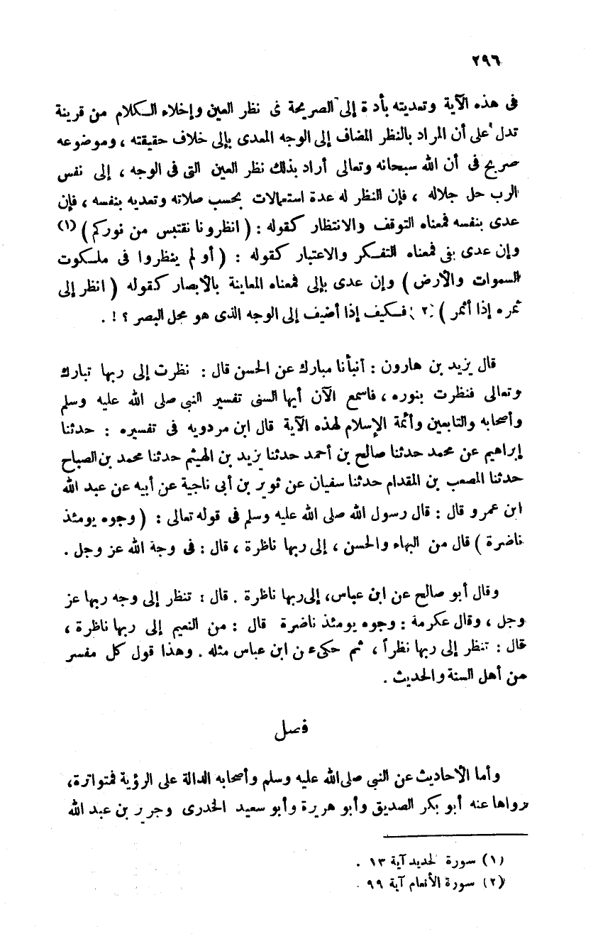 في هذه الآية وتعديته بأداة إلى الصريحة في نظر العين وإخلاء الكلام من قرينة تدل على أن المراد بالنظر المضاف إلى الوجه المعدي بإلى خلاف حقيقته وموضوعه صريح في أن الله سبحانه وتعالى أراد بذلك نظر العين وإخلاء الكلام من قرينه تدل على أن المراد بالنظر المضاف إلى الوجه المعدي بالي خلاف حقيقة وموضوعه صريح في أن الله سبحانه وتعالى أراد بذلك نظر العين التي في الوجه إلى نفس الرب جل جلاله فان النظر له عدة استعمالات بحسب صلاته وتعديه بنفسه فان عدى بنفسه فمعناه التوقف والانتظار كقوله {انْظُرُونَا نَقْتَبِسْ مِنْ نُورِكُمْ} وأن عدى بـ:"في" فمعناه التفكر والاعتبار كقوله أو لم ينظروا في ملكوت السماوات والأرض وأن عدى بـ: "إلى" فمعناه المعاينة بالأبصار كقوله {انْظُرُوا إِلَى ثَمَرِهِ إِذَا أَثْمَرَ} فكيف إذا أضيف إلى الوجه الذي هو محل البصر قال يزيد بن هارون أنبانا مبارك عن الحسن قال نظرت إلى ربها تبارك وتعالى فنظرت بنوره فاسمع الآن أيها السني تفسير النبي صلى الله عليه وسلم وأصحابه والتابعين وأئمة الإسلام لهذه الآية قال ابن مردويه في تفسيره حدثنا إبراهيم عن محمد حدثنا صالح بن احمد حدثنا يزيد بن الهيثم حدثنا محمد ابن الصباح حدثنا المصعب بن المقدام حدثنا سفيان عن ثوير بن أبي ناجية عن أبيه عن عبد الله بن عمرو قال قال رسول الله في قوله تعالى: {وُجُوهٌ يَوْمَئِذٍ نَاضِرَةٌ} قال من البهاء والحسن إلى ربها ناظرة قال في وجه الله عز وجل وقال أبو صالح عن ابن العباس إلى ربها ناظرة قال تنظر إلى وجه ربها عز وجل وقال عكرمة وجوه يومئذ ناضرة قال من النعيم إلى ربها ناظرة قال تنظر إلى ربها نظرا ثم حكى عن ابن عباس مثله وهذا قول كل مفسر من أهل السنة والحديث.
