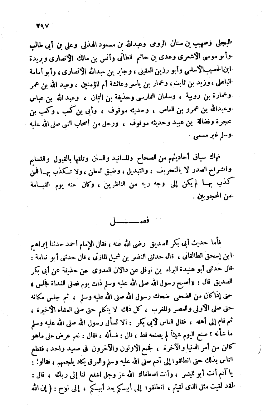 البجلي وصهيب بن سنان الرومي وعبد الله بن مسعود الهذلي وعلي ابن أبي طالب وأبو موسى الأشعري وعدي بن حاتم الطائي وانس بن مالك الأنصاري وبريدة بن الحصيب الأسلمي وأبو رزين العقيلي وجابر بن عبد الله الأنصاري وأبو أمامة الباهلي وزيد بن ثابت وعمار بن ياسر وعائشة أم المؤمنين وعبد الله بن عمر وعمارة بن رويبة وسلمان الفارسي وحذيفة بن اليمان وعبد الله ابن عباس وعبد الله بن عمرو بن العاص وحديثه موقوف وأبي بن كعب وكعب بن عجرة وفضالة بن عبيد وحديثه موقوف ورجل من أصحاب النبي صلى الله عليه وسلم غير مسمى فهاك سياق أحاديثهم من الصحاح والمسانيد والسنن وتلقاها بالقبول والتسليم وانشراح الصدر لا بالتحريف والتبديل وضيق العطن ولا تكذب بها فمن كذب بها لم يكن إلى وجه ربه من الناظرين وكان عنه يوم القيامة من المحجوبين فصل فأما حديث أبي بكر الصديق رضي الله عنه فقال الإمام احمد حدثنا إبراهيم ابن إسحاق الطالقاني قال حدثني النضر بن شميل المازني قال حدثني أبو نعامة قال حدثني أبو عنيدة البراء بن نوفل عن دالان العدوي عن حذيفة عن أبي بكر الصديق قال أصبح رسول الله صلى الله عليه وسلم ذات يوم فصلى الغداة فجلس حتى إذا كان من الضحى ضحك الرسول ثم جلس مكانه حتى صلى الأولى والعصر والمغرب كل ذلك لا يتكلم حتى صلى العشاء الأخيرة ثم قام إلى أهله فقال الناس لأبي بكر: ألا تسأل رسول الله ما شانه صنع اليوم شيئا لم يصنعه قط قال فسأله فقال نعم عرض علي ما هو كائن من أمر الدنيا والآخرة فجمع الأولون والآخرون في صعيد واحد فقطع الناس بذلك حتى انطلقوا إلى آدم والعرق ويكتد يلجمهم فقالوا يا آدم أنت أبو البشر وأنت اصطفاك الله عز وجل اشفع لنا إلى ربك قال قد لقيت مثل الذي لقيتم انطلقوا إلى أبيكم بعد أبيكم إلى نوح: {إِنَّ اللَّهَ