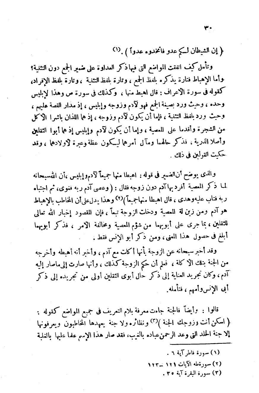 وتأمل كيف اتفقت المواضع التي فيها ذكر العداوة على ضمير الجمع دون التثنية؟ وأما الإهباط فتارة يذكره بلفظ الجمع وتارة بلفظ التثنية وتارة بلفظ الأفراد كقوله في سورة الأعراف قال اهبط منها وكذلك في سورة ص وهذا لإبليس وحده وحيث ورد بصيغة الجمع فهو لآدم وزوجه وإبليس إذ مدار القصة عليهم وحيث ورد بلفظ التثنية فأما أن يكون لآدم وزوجه إذ هما اللذان باشرا الأكل من الشجرة وأقدما على المعصية وإما أن يكون لآدم وإبليس إذ هما أبوا الثقلين وأصلا الذرية فذكر حالهما ومآل أمرهما ليكون عظة وعبرة لأولادهما وقد حكيت القولين في ذلك.