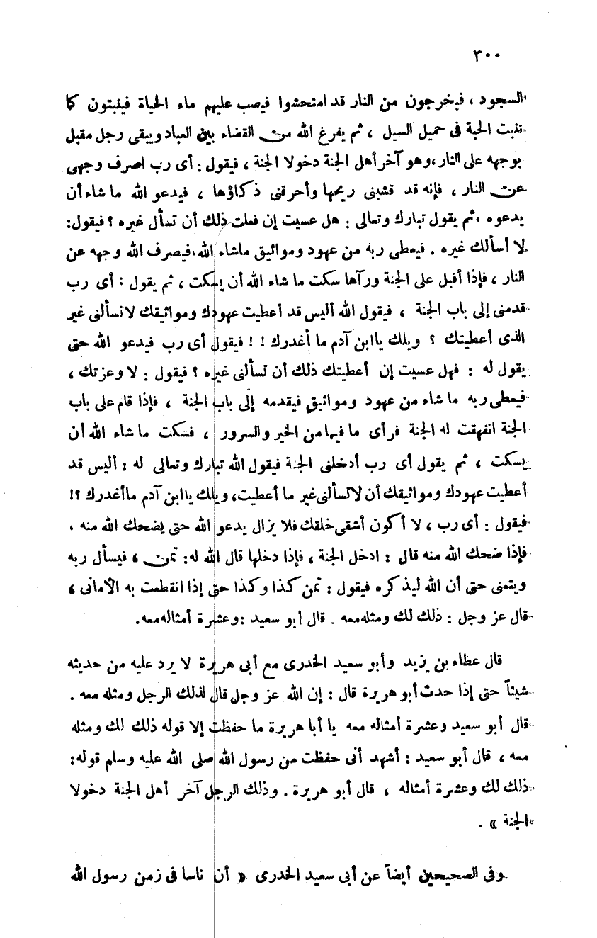 السجود فيخرجون من النار قد امتحشوا فيصب عليهم ماء الحياة فينبتون كما تنبت الحبة في حميل السيل ثم يفرغ الله من القضاء بين العباد ويبقى رجل مقبل بوجهه على النار وهو آخر أهل الجنة دخولا الجنة فيقول أي رب اصرف وجهي عن النار فانه قد شبني ريحها واحرقني ذكاؤها فيدعو الله ما شاء الله أن يدعوه ثم يقول الله تبارك وتعالى هل عسيت إن فعلت ذلك أن تسأل غيره فيقول لا أسألك غيره فيعطي ربه من عهود ومواثيق ما شاء الله فيصرف الله عن وجهه عن النار فإذا اقبل على الجنة ورآها سكت ما شاء الله أن يسكت ثم يقول أي ربي قدمني الى باب الجنة فيقول الله أليس قد أعطيت عهودك ومواثيقك لا تسألني غير الذي أعطيتك ويلك يا ابن آدم ما أغدرك فيقول أي ربي فيدعو الله حتى يقول له فهل عسيت إن أعطيتك ذلك أن تسألني غيره فيقول لا وعزتك فيعطي ربه ما شاء من عهود ومواثيق فيقدمه الله تعالى إلى باب الجنة فإذا قام على باب الجنة أنفهقت له الجنة فرأى ما فيها من الخير والسرور فسكت ما شاء الله أن يسكت ثم يقول أي رب أدخلني الجنة فيقول الله تبارك وتعالى له أليس قد أعطيت عهودك ومواثيقك أن لا تسألني غير ما أعطيت ويلك يا ابن آدم ما أغدرك فيقول أي رب لا أكون أشقى خلقك فلا يزال يدعو الله حتى يضحك الله منه فإذا ضحك الله منه قال ادخل الجنة فإذا دخلها قال الله له تمن فيسأل ربه ويتمنى حتى إن الله ليذكره فيقول تمن كذا وكذا حتى إذا انقطعت به الأماني قال الله عز وجل ذلك لك ومثله معه قال أبو سعيد الخدري وعشرة أمثاله معه قال عطاء بن يزيد وأبو سعيد الخدري مع أبي هريرة لا يرد عليه من حديثه شيئا حتى إذا حدث أبو هريرة قال إن الله عز وجل قال لذلك الرجل ومثله معه قال أبو سعيد وعشرة أمثاله معه يا أبا هريرة قال أبو هريرة ما حفظت إلا قوله ذلك لك ومثله معه قال أبو سعيد اشهد إني حفظت من رسول الله قوله ذلك لك وعشرة أمثاله قال أبو هريرة وذلك الرجل آخر أهل الجنة دخولا الجنة