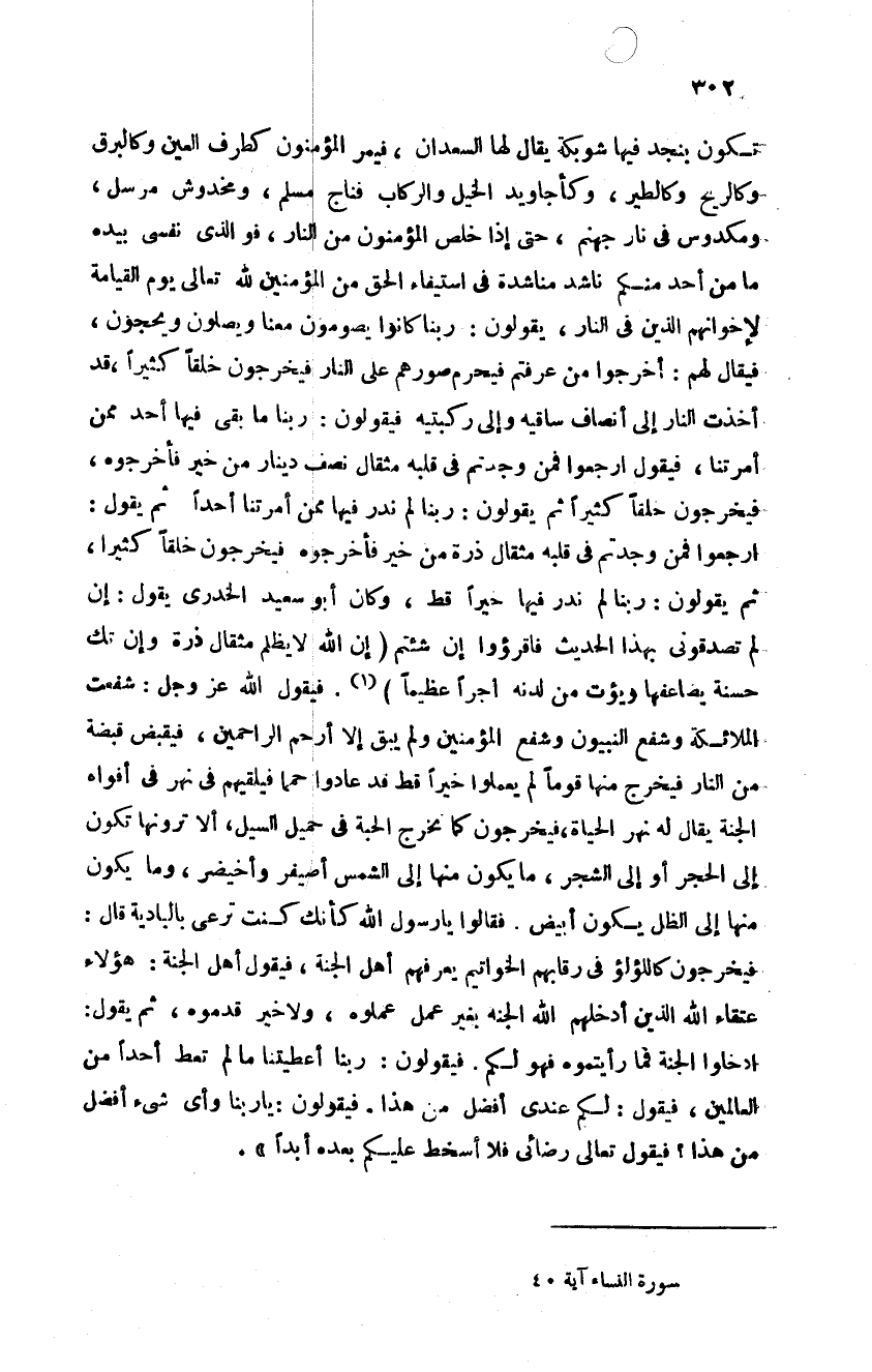 تكون بنجد فيها شويكة يقال لها السعدان فيمر المؤمنون كطرف العين وكالبرق وكالريح وكالطير وكأجاويد الخيل والركاب فناج مسلم ومخدوش مرسل ومكدوس في نار جهنم حتى إذا خلص المؤمنون من النار فو الذي نفسي بيده ما من أحد منكم بأشد مناشدة في استيفاء الحق من المؤمنين لله تعالى يوم القيامة لإخوانهم الذين في النار يقولون ربنا كانوا يصومون معنا ويصلون ويحجون فيقال لهم اخرجوا من عرفتهم فيحرم صورهم على النار فيخرجون خلقا كثيرا قد أخذت النار إلى أنصاف ساقيه وإلى ركبتيه فيقولون ربنا ما بقي فيها أحد ممن أمرتنا فيقول ارجعوا فمن وجدتم في قلبه مثقال نصف دينار من خير فأخرجوه فيخرجون خلقا كثيرا ثم يقولون ربنا لم ندر فيها ممن أمرتنا أحدا ثم يقول ارجعوا فمن وجدتم في قلبه مثقال ذرة من خير فأخرجوه فيخرجون خلقا كثيرا ثم يقولون ربنا لم بقى تدر فيها أحد ممن أمرتنا فيقول ارجعوا فمن وجدتم في قلبه مثقال نصف دينار من خير فأخرجوه فيخرجون خلقا كثيرا ثم يقولون ربنا لم ندر فيها ممن أمرتنا أحدا ثم يقول ارجعوا فمن وجدتم في قلبه مثقال ذرة من خير فأخرجوه فيخرجون خلقا كثيرا ثم يقولون ربنا لم نذر فيها ممن أمرتنا أحدا ثم يقول ارجعوا فمن وجدتم في قلبه مثقال ذرة من خير فأخرجوه فيخرجون خلقا كثيرا ثم يقولون ربنا لم ندر فيها خيرا قط وكان أبو سعيد الخدري يقول إن لم تصدقوني بهذا الحديث فاقرؤوا إن شئتم: {إِنَّ اللَّهَ لا يَظْلِمُ مِثْقَالَ ذَرَّةٍ وَإِنْ تَكُ حَسَنَةً يُضَاعِفْهَا وَيُؤْتِ مِنْ لَدُنْهُ أَجْراً عَظِيماً} فيقول الله عز وجل شفعت الملائكة وشفع النبي صلى الله عليه وسلمون وشفع المؤمنون ولم يبق إلا ارحم الراحمين فيقبض قبضة من النار فيخرج منها قوم لم يعملوا خيرا قط قد عادوا حمما فيلقيهم في نهر في أفواه الجنة يقال له نهر الحياة فيخرجون كما تخرج الحبة في حميل السيل إلا ترونها تكون إلى الحجر أو إلى الشجر ما يكون منها إلى الشمس أصيفر وأخيضر وما يكون منها إلى الظل يكون أبيض فقالوا يا رسول الله صلى الله عليه وسلم كأنك كنت ترعى بالبادية قال فيخرجون كاللؤلؤ في رقابهم الخواتيم يعرفهم أهل الجنة فيقول أهل الجنة هؤلاء عتقاء الله الذين أدخلهم الله الجنة بغير عمل عملوه ولا خير قدموه ثم يقول ادخلوا الجنة فما رأيتموه فهو لكم فيقولون ربنا أعطيتنا ما لم تعط أحدا من العالمين فيقول لكم عندي أفضل من هذا فيقولون يا ربنا وأي شيء أفضل من هذا فيقول تعالى رضائي فلا اسخط عليكم بعده أبدا"