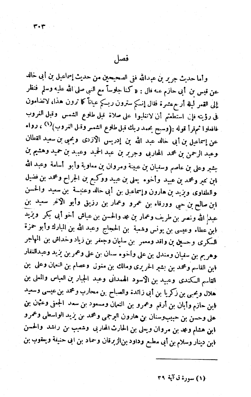 وأما حديث جرير بن عبد الله ففي الصحيحين من حديث إسماعيل بن أبي خالد عن قيس بن أبي حازم عنه قال كنا جلوسا مع النبي صلى الله عليه وسلم فنظر إلى القمر ليلة أربع عشرة فقال إنكم سترون ربكم عيانا كما ترون هذا لا تضامون في رؤيته فإن استطعتم أن لا تغلبوا على صلاة قبل طلوع الشمس وقبل الغروب فافعلوا ثم قرأ قوله فسبح بحمد ربك قبل طلوع الشمس وقبل الغروب رواه عن إسماعيل بن أبي خالد عبد الله بن إدريس الأزدي ويحيى بن سعيد القطان وعبد الرحمن بن محمد المحاربي وجرير بن عبد الحميد وعبيد بن حميد وهشيم بن بشير وعلي بن عاصم وسفيان بن عيينة ومروان بن معاوية وأبو أسامة وعبد الله بن نمير ومحمد بن عبيد وأخوه يعلى بن عبيد ووكيع بن الجراح ومحمد بن الفضيل والطفاوي ويزيد بن هارون وإسماعيل ابن أبي خالد وعنبسة بن سعيد والحسن بن صالح بن حي وورقاء بن عمرو وعمار بن زريق وأبو الأعز سعيد ابن عبد الله ونصر بن طريف وعمار بن محمد والحسن بن عياش أخو أبو بكر ويزيد بن عطاء وعيسى بن يونس وشعبة بن الحجاج وعبد الله بن المبارك وأبو حمزة السكري وحسين بن واقد ومعمر بن سليمان وجعفر بن زياد وخداش بن المهاجر وهريم ابن سفيان ومندل بن علي وأخوه سنان بن علي وعمر بن يزيد وعبد الغفار بن القاسم ومحمد بن بشير الحريري ومالك بن مغول وعصام بن النعمان وعلي بن القاسم الكندي وعبيد بن الأسود الهمدإني وعبد الجبار ابن العباس والمعلى بن هلال ويحيى بن زكريا ابن أبي زائدة والصباح بن محارب ومحمد بن عيسى وسعيد بن حازم وأبان بن أرقم وعمرو بن النعمان ومسعود بن سعد الجعفي وعثمان بن علي وحسن بن حبيب وسنان بن هارون البرجمي ومحمد بن يزيد الواسطي وعمرو بن هشام ومحمد بن مروان ويعلى بن الحارث المحاربي وشعيب بن راشد والحسن بن دينار وسلام ابن أبي مطيع وداود بن الزبرقان وحماد بن أبي حنيفة ويعقوب بن