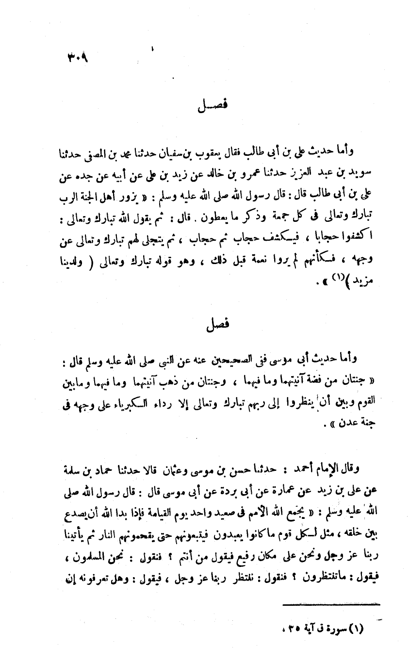فصل وأما حديث أبي موسى ففي الصحيحين عنه عن النبي صلى الله عليه وسلم قال "جنتان من فضة آنيتهما وما فيهما وجنتان من ذهب آنيتهما وما فيهما وما بين القوم وبين أن ينظروا إلى ربهم تبارك وتعالى إلا رداء الكبرياء على وجهه في جنة عدن" وقال الإمام احمد حدثنا حسن بن موسى وعثمان قالا حدثنا حماد بن سلمة عن علي بن زيد عن عمارة عن أبي بردة عن أبي موسى قال قال رسول الله صلى الله عليه وسلم "يجمع الله الأمم في صعيد واحد يوم القيامة فإذا بدا لله أن يصدع بين خلقه مثل لكل قوم ما كانوا يعبدون فيتبعونهم حتى يقحمونهم النار ثم يأتينا ربنا عز وجل ونحن على مكان رفيع فيقول من أنتم فنقول نحن المسلمون فيقول ما تنتظرون فنقول ننتظر ربنا عز وجل فيقول وهل تعرفونه إن