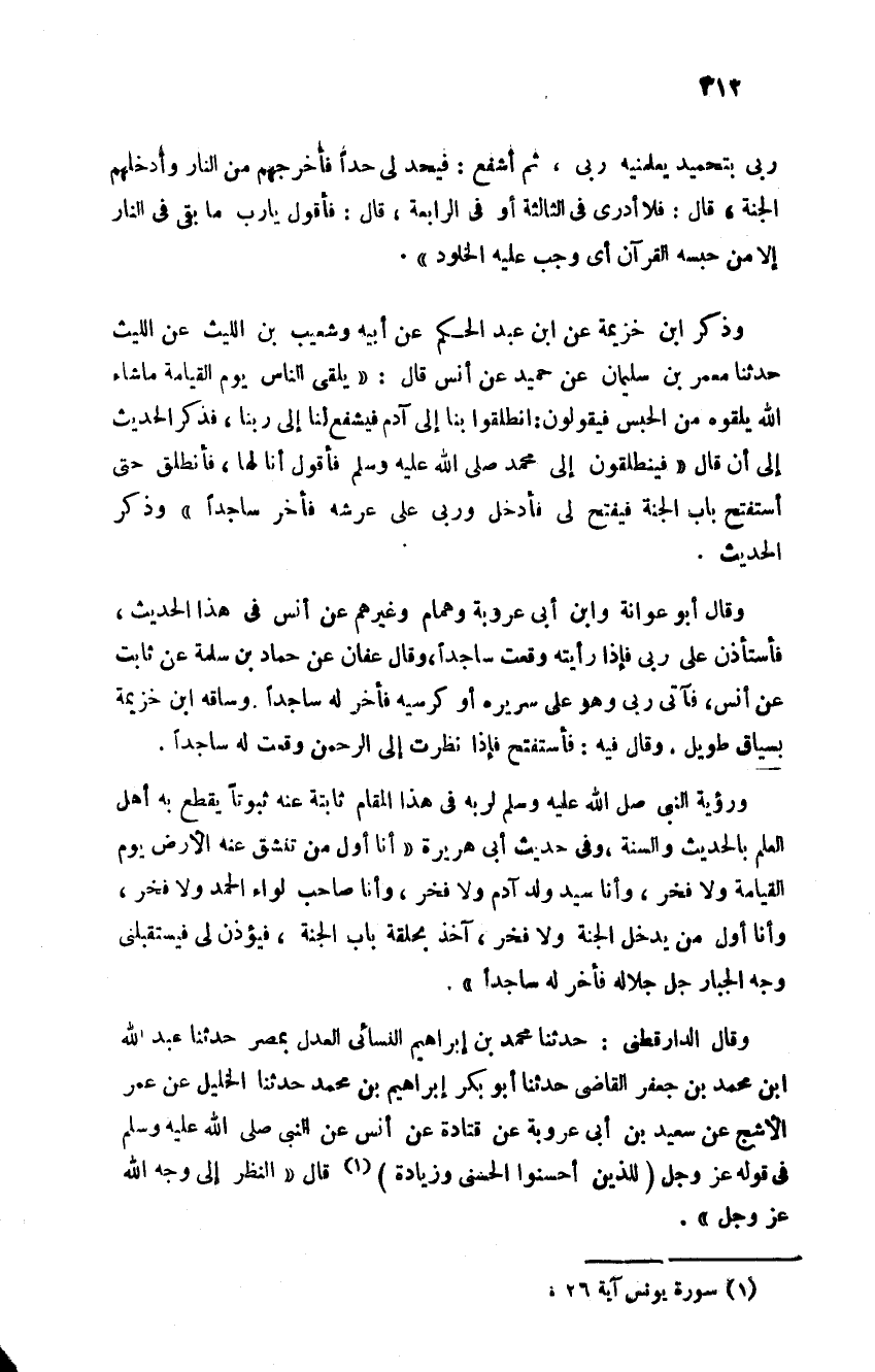 ربي بتحميد يعلمنيه ربي ثم اشفع فيجد لي حدا فأخرجهم من النار وأخلهم الجنة قال فلا أدري في الثالثة أو في الرابعة قال فأقول يا رب ما بقي في النار إلا من حبسه القرآن أي وجب عليه الخلود" وذكر ابن خزيمة عن ابن عبد الحكم عن أبيه وشعيب بن الليث عن الليث حدثنا معمر بن سليمان عن حميد عن أنس قال: يلقى الناس يوم القيامة ما شاء الله أن يلقوه من الحبس فيقولون انطلقوا بنا إلى آدم فيشفع لنا إلى ربنا فذكر الحديث إلى أن قال فينطلقون إلى محمد فأقول أنا لها فانطلق حتى استفتح باب الجنة فيفتح لي فادخل وربي على عرشه فأخر ساجدا وذكر الحديث وقال أبو عوانة وابن أبي عروبة وهمام وغيرهم عن أنس في هذا الحديث فاستأذن على ربي فإذا رايته وقعت ساجدا وقال عفان عن حماد بن سلمة عن ثابت عن أنس فآتي ربي وهو على سريره أو كرسيه فأخر له ساجدا له وساقه ابن خزيمة بسياق طويل وقال فيه فاستفتح فإذا نظرت إلى الرحمن وقعت له ساجدا له ورؤية النبي صلى الله عليه وسلم لربه في هذا المقام ثابتة عنه ثبوتا يقطع به أهل العلم بالحديث والسنة وفي حديث أبي هريرة أنا أول من تنشق عنه الأرض يوم القيامة ولا فخر وأنا سيد ولد آدم ولا فخر وأنا صاحب لواء الحمد ولا فخر وأنا أول من يدخل الجنة ولا فخر اخذ بحلقة باب الجنة فيؤذن لي فيستقبلني وجه الجبار جل جلاله فاخر له ساجدا وقال الدارقطني حدثنا محمد بن إبراهيم النسائي العدل بمصر حدثنا عبد الله بن محمد بن جعفر القاضي حدثنا أبو بكر إبراهيم بن محمد حدثنا الخليل عن عمر الأشج عن سعيد بن أبي عروبة عن قتادة عن أنس عن النبي صلى الله عليه وسلم في قول الله عز وجل: {لِلَّذِينَ أَحْسَنُوا الْحُسْنَى وَزِيَادَةٌ} قال النظر إلى وجه الله تعالى عز وجل