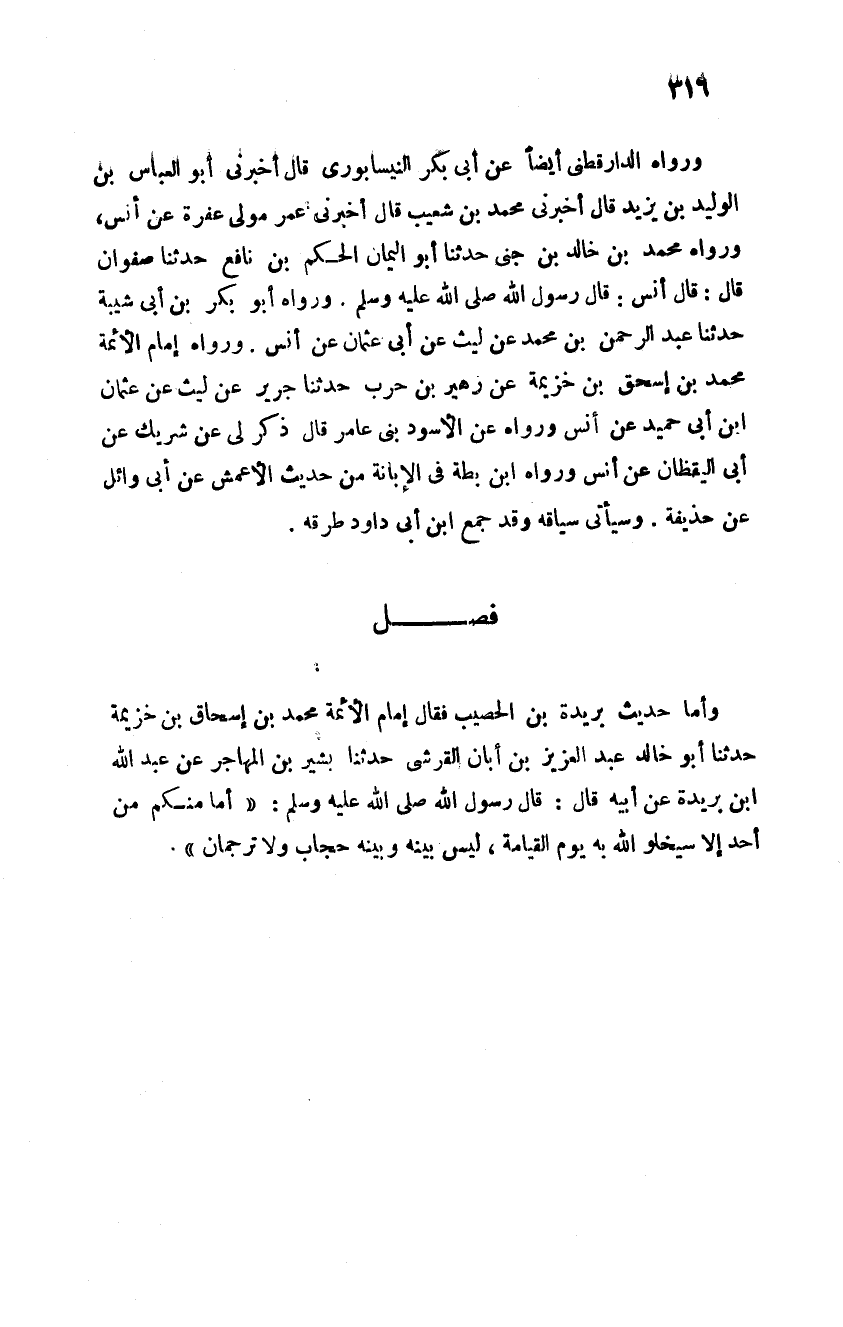 ورواه الدارقطني أيضا عن أبي بكر النيسابوري قال أخبرني أبو العباس بن الوليد بن يزيد قال اخبرني محمد بن شعيب قال اخبرني عمر مولى عفرة عن أنس ورواه محمد بن خالد بن جني حدثنا أبو اليمان الحكم بن نافع حدثنا صفوان قال قال أنس قال رسول الله ورواه أبو بكر بن أبي شيبة حدثنا عبد الرحمن بن محمد عن ليث عن أبي عثمان عن أنس ورواه إمام الأئمة محمد بن إسحاق بن خزيمة عن زهير بن حرب حدثنا جرير عن ليث عن عثمان بن أبي حميد عن أنس ورواه الأسود بن عامر قال ذكر لي عن شريك عن أبي اليقظان عن أنس ورواه ابن بطة في الإبانة من حديث الأعمش عن أبي وائل عن حذيفة وسيأتي سياقه وقد جمع ابن أبي داود طرقه فصل وأما حديث بريدة بن الحصيب فقال إمام الأئمة محمد بن إسحاق بن خزيمة حدثنا أبو خالد عبد العزيز بن إبان القرشي حدنا بشير بن المهاجر عن عبد الله بن بريدة عن أبيه قال قال رسول الله "أما منكم من أحد إلا سيحلو الله به يوم القيامة ليس بينه وبينه حجاب ولا ترجمان"