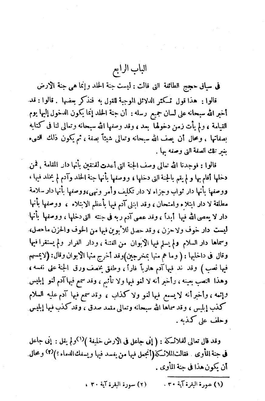 الباب الرابع: في سياق حجج الطائفة التي قالت ليست جنة الخلد وإنما هي جنة في الأرض.