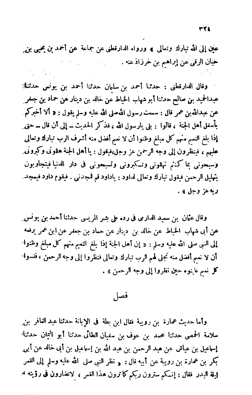 عين إلى الله تبارك وتعالى" ورواه الدارقطني عن جماعة عن احمد بن يحيى بن حبان الرقي عن إبراهيم بن خرزاذ عنه وقال الدارقطني حدثنا احمد بن سليمان حدثنا احمد بن يونس حدثنا عبد الحميد بن صالح حدثنا أبو شهاب الخياط عن خالد بن دينار عن حماد بن جعفر عن عبد الله بن عمر قال سمعت رسول الله يقول" إلا أخبركم بأسفل أهل الجنة قالوا بلى يا رسول الله صلى الله عليه وسلم فذكر الحديث إلى أن قال حتى إذا بلغ النعيم منهم كل مبلغ وظنوا أن لا نعيم أفضل منه واشرف الرب تبارك وتعالى عليهم فينظرون إلى وجه الرحمن عز وجل فيقول يا أهل الجنة هللوني وكبروني وسبحوني بما كنتم تهللونني وتكبروني وتسبحوني في دار الدنيا فيتجاوبون بتهليل الرحمن فيقول تبارك وتعالى لداود يا داود قم فمجدني فيقوم داود فيمجد ربه عز وجل" وقال عثمان بن سعيد الدارمي في رده على بشر المريسي حدثنا احمد بن يونس عن أبي شهاب الخياط عن خالد بن دينار عن حماد بن جعفر عن ابن عمر يرفعه إلى النبي صلى الله عليه وسلم إن أهل الجنة إذا بلغ النعيم منهم كل مبلغ وظنوا أن لا نعيم افضل منه تجلى لهم الرب تبارك وتعالى فنظروا إلى وجه الرحمن فنسوا كل نعيم عاينوه حين نظروا إلى وجه الرحمن فصل وأما حديث عمارة بن رويبة فقال ابن بطة في الإبانة حدثنا عبد الغافر بن سلامة الحمصي حدثنا محمد بن عوف بن سفيان الطائي حدثنا أبو اليمان حدثنا إسماعيل بن عياش عن عبد الرحمن بن عبد الله بن إسماعيل بن أبي خالد عن أبي بكر بن عمارة بن رويبة عن أبيه قال نظر النبي صلى الله عليه وسلم إلى القمر ليلة البدر فقال: "إنكم سترون ربكم كما ترون هذا القمر لا تضارون في رؤيته فإن استطعتم ألا تغلبوا على صلاة قبل طلوع الشمس وصلاة قبل غروبها فافعلوا" قال ابن بطة واخبرني أبو القاسم بن عمر بن احمد عن أبي بكر احمد بن هارون حدثنا عبد الرزاق بن منصور حدثنا المغيرة حدثنا المسعودى عن إسماعيل بن أبي خالد عن أبي بكر بن عمارة بن رويبة عن أبيه قال: نظر رسول الله إلى القمر ليلة البدر فقال: "إنكم سترون ربكم تبارك وتعالى كما ترون هذا القمر لا تضامون في رؤيته