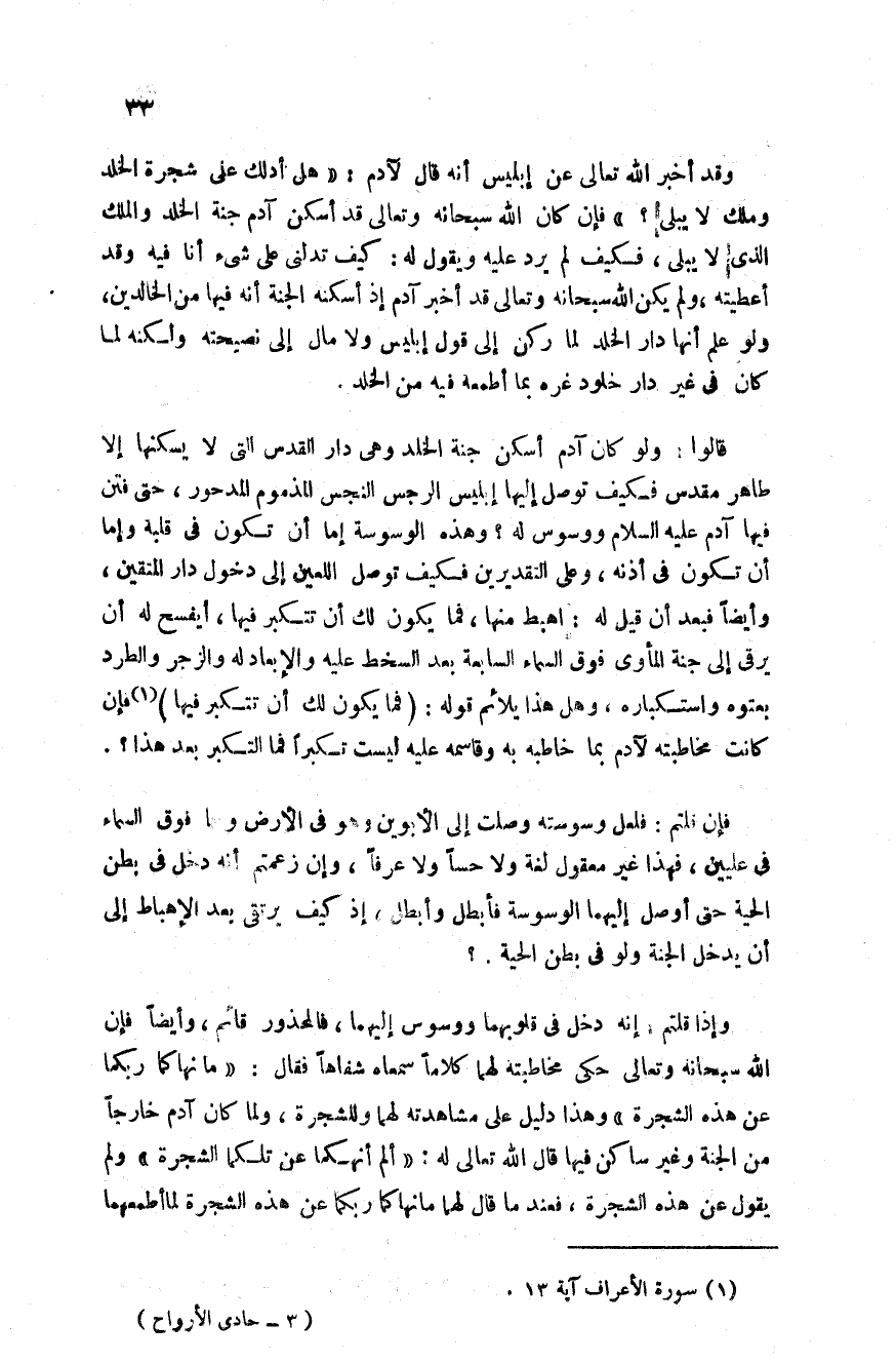 وإذا قلتم إنه دخل في قلوبهما ووسوس إليهما فالمحذور قائم وأيضا فإن الله سبحانه وتعالى حكى مخاطبته لهما كلاما سمعاه شفاها فقال: ما نهاكما ربكما عن هذه الشجرة وهذا دليل على مشاهدته لهما وللشجرة ولما كان آدم خارجا من الجنة وغير ساكن فيها قال الله تعالى له: {أَلَمْ أَنْهَكُمَا عَنْ تِلْكُمَا الشَّجَرَةِ} ولم يقل عن هذه الشجرة فعندما قال لهما: ما نهاكما ربكما عن هذه الشجرة لما أطعمهما