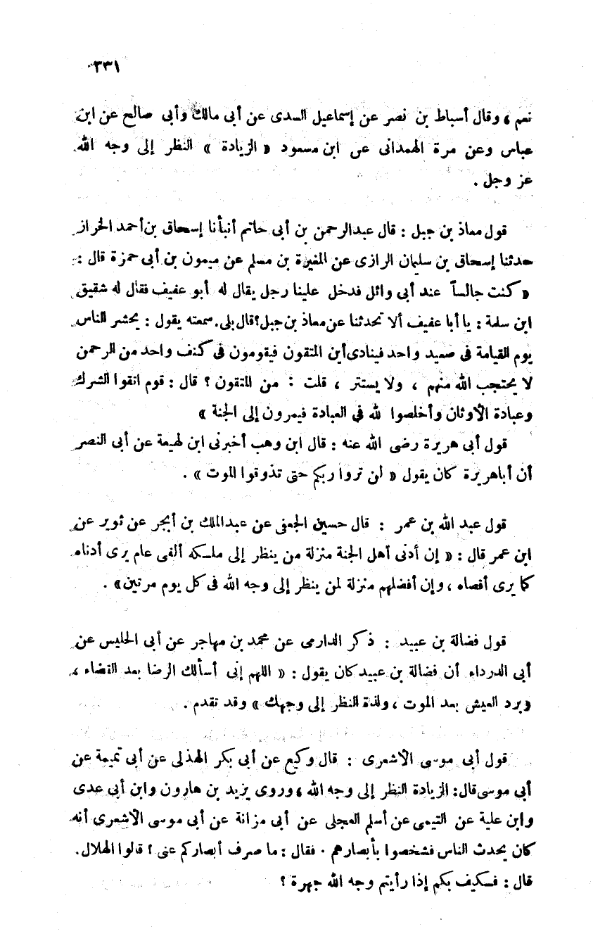 نعم وقال أسباط بن نصر عن إسماعيل السدي عن أبي ملك وأبي صالح عن ابن عباس وعن مرة الهمداني عن ابن مسعود لزيادة النظر إلى وجه الله تبارك وتعالى قول معاذ بن جبل قال عبد الرحمن بن أبي حاتم أنبانا إسحاق بن احمد الخراز حدثنا إسحاق بن سليمان الرازي عن المغيرة بن مسلم عن ميمون بن أبي حمزة قال كنت جالسا عند أبي وائل فدخل علينا رجل يقال له أبو عفيف فقال له شقيق بن سلمة يا أبا عفيف إلا تحدثنا عن معاذ بن جبل قال بلى سمعته يقول يحشر الناس يوم القيامة في صعيد واحد فينادي أين المتقون فيقومون في كنف واحد من الرحمن لا يحتجب الله منهم ولا يستتر قلت من المتقون قال قوم اتقوا الشرك وعبادة الأوثان واخلصوا لله في العبادة فيمرون إلى الجنة قول أبي هريرة رضي الله عنه قال ابن وهب اخبرني ابن لهيعة عن أبي النصر أن أبا هريرة كان يقول لن تروا ربكم حتى تذوقوا الموت قول عبد الله بن عمر قال حسين الجعفي عن عبد الملك بن ابجر عن ثوير عن ابن عمر قال إن أدنى أهل الجنة منزلة من ينظر إلى ملكه ألفي عام يرى أدناه كما يرى أقصاه وإن أفضلهم منزلة لمن ينظر إلى وجه الله في كل يوم مرتين قول فضالة بن عبيد ذكر الدارمي عن محمد بن مهاجر عن أبي حليس عن أبي الدرداء أن فضالة بن عبيد كان يقول اللهم إني أسألك الرضا بعد القضاء وبرد العيش بعد الموت ولذة النظر إلى وجهك وقد تقدم