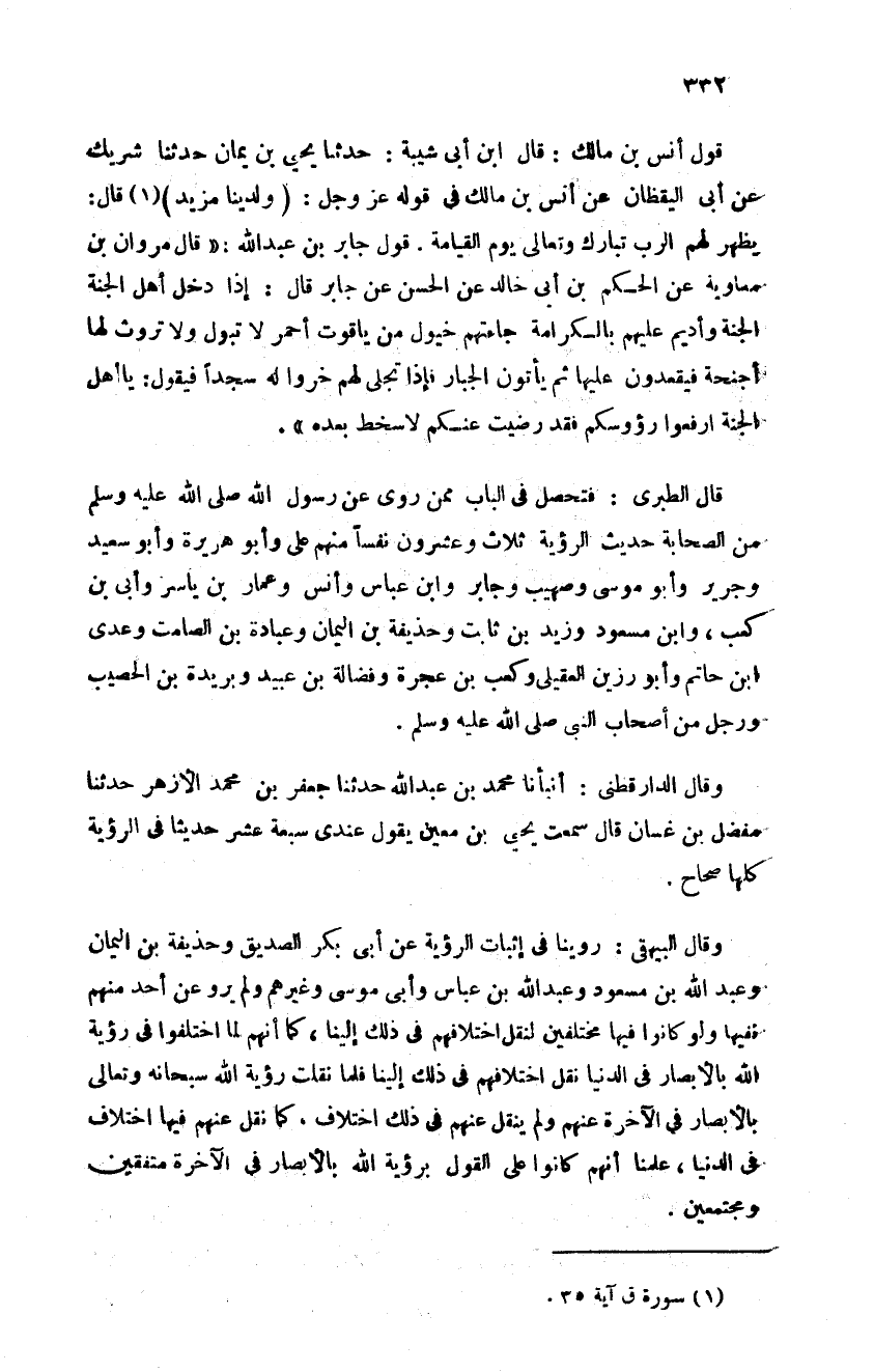 قول أنس بن مالك قال ابن أبي شيبة حدثنا يحيى بن يمان حدثنا شريك عن أبي اليقظان عن أنس بن مالك في قوله عز وجل ولدينا مزيد قال يظهر لهم الرب تبارك وتعالى يوم القيامة قول جابر بن عبد الله قال مروان بن معاوية عن الحكم بن أبي خالد عن الحسن عن جابر قال إذا دخل أهل الجنة الجنة وأديم عليهم بالكرامة جاءتهم خيول من ياقوت احمر لا تبول ولا تروث لها أجنحة فيقعدون عليها ثم يأتون الجبار فإذا تجلى لهم خروا له سجدا فيقول يا أهل الجنة ارفعوا رؤوسكم فقد رضيت عنكم لا سخط بعده قال الطبري فتحصل في الباب ممن روى عن رسول الله من الصحابة حديث الرؤية ثلاث وعشرون نفسا منهم علي وأبو هريرة وأبو سعيد وجرير وأبو موسى وصهيب وجابر وابن عباس وانس وعمار بن ياسر وأبي ابن كعب وابن مسعود وزيد بن ثابت وحذيفة بن اليمان وعبادة بن الصامت وعدي بن حاتم وأبو رزين العقيلي وكعب بن عجرة وفضالة بن عبيد وبريدة بن الحصيب ورجل من أصحاب النبي صلى الله عليه وسلم وقال الدارقطني أنبأنا محمد بن عبد الله حدثنا جعفر بن محمد الأزهر حدثنا مفضل بن غسان قال سمعت يحيى بن معين يقول عندي سبعة عشر حديثا في الرؤية كلها صحاح وقال البيهقي روينا في إثبات الرؤية عن أبي بكر الصديق وحذيفة بن اليمان وعبد الله بن مسعود وعبد الله بن عباس وأبي موسى وغيرهم ولم يرو عن أحد منهم نفيها ولو كانوا فيها مختلفين لنقل اختلافهم في ذلك إلينا فلما نقلت رؤية الله سبحانه وتعالى بالأبصار في الآخرة عنهم ولم ينقل عنهم في ذلك اختلاف كما نقل عنهم فيها اختلاف في الدنيا علمنا أنهم كانوا على القول برؤية الله بالأبصار في الآخرة متفقين ومجتمعين
