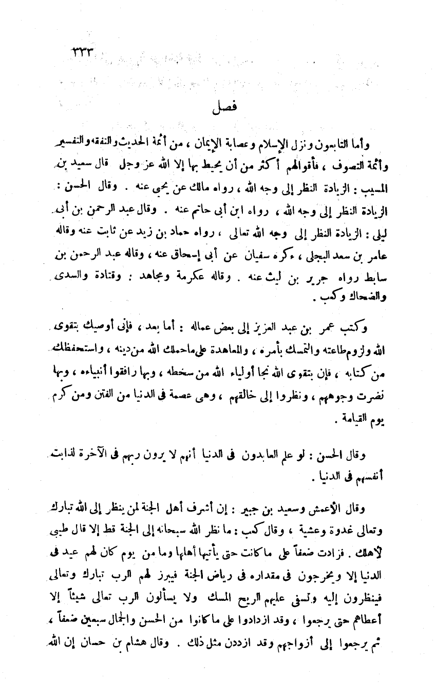 وأما التابعون ونزل الإسلام وعصابة الإيمان من أئمة الحديث والفقه والتفسير وأئمة التصوف فأقوالهم أكثر من أن يحيط بها إلا الله عز وجل قال سعيد بن المسيب الزيادة النظر إلى وجه الله رواه مالك عن يحيى عنه وقال الحسن الزيادة النظر إلى وجه الله رواه ابن أبي حاتم عنه وقال عبد الرحمن بن أبي ليلى الزيادة النظر إلى وجه الله تعالى رواه حماد بن زيد عن ثابت عنه وقاله عامر بن سعد البجلي ذكره سفيان عن أبي إسحاق عنه وقاله عبد الرحمن ابن سابط رواه جرير بن ليث عنه وقاله عكرمة ومجاهد وقتادة والسدي والضحاك وكعب وكتب عمر بن عبد العزيز إلى بعض عماله أما بعد فاني أوصيك بتقوى الله ولزوم طاعته والتمسك بأمره والمعاهدة على ما حملك الله من دينه واستحفظك من كتابه فإن بتقوى الله نجا أولياء الله من سخطه وبها رافقوا أنبياءه وبها نضرت وجوههم ونظروا إلى خالقهم وهي عصمة في الدنيا ومن الفتن ومن كرب يوم القيامة وقال الحسن لو علم العابدون في الدنيا أنهم لا يرون ربهم في الآخرة لذابت أنفسهم في الدنيا وقال الأعمش وسعيد بن جبير أن اشرف أهل الجنة لمن ينظر إلى الله تبارك وتعالى غدوة وعشية وقال كعب ما نظر الله سبحانه إلى الجنة قط إلا قال طيبي لأهلك فزادت ضعفا على ما كانت حتى يأتيها أهلها وما من يوم كان لهم عيد في الدنيا إلا ويخرجون في مقداره في رياض الجنة فيبرز لهم الرب تبارك وتعالى فينظرون إليه وتسفى عليهم الريح المسك ولا يسألون الرب تعالى شيئا إلا أعطاهم حتى يرجعوا وقد ازدادوا على ما كانوا عليه من الحسن والجمال سبعين ضعفا ثم يرجعون إلى أزواجهم وقد ازددن مثل ذلك وقال هشام بن حسان