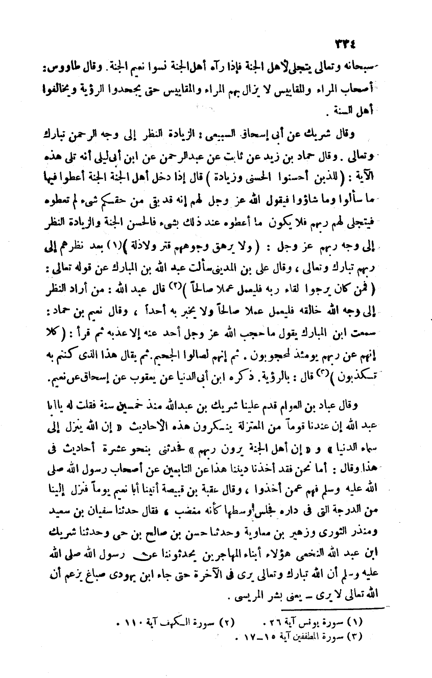 أن الله سبحانه وتعالى يتجلى لأهل الجنة فإذا رآه أهل الجنة نسوا نعيم الجنة وقال طاووس أصحاب المرآء والمقاييس لا يزال بهم المرآء والمقاييس حتى يجحدوا الرؤية ويخالفوا أهل السنة وقال شريك عن أبي إسحاق السبيعي الزيادة النظر إلى وجه الرحمن تبارك وتعالى وقال حماد بن زيد عن ثابت عن عبد الرحمن بن أبي ليلى أنه تلا هذه الآية: {لِلَّذِينَ أَحْسَنُوا الْحُسْنَى وَزِيَادَةٌ} قال إذا دخل أهل الجنة الجنة أعطوا فيها ما سألوا وما شاؤا فيقول الله عز وجل لهم أنه قد بقي من حقكم شيء لم تعطوه فتجلى لهم ربهم فلا يكون ما أعطوه عند ذلك بشيء فالحسنى الجنة والزيادة النظر إلى وجه ربهم عز وجل ولا يرهق وجوههم قتر ولا ذلة بعد نظرهم إلى ربهم تبارك وتعالى وقال علي بن المديني سألت عبد الله بن المبارك عن قوله تعالى: {فَمَنْ كَانَ يَرْجُوا لِقَاءَ رَبِّهِ فَلْيَعْمَلْ عَمَلاً} قال عبد الله من أراد النظر إلى وجه الله تبارك وتعالى خالقه فليعمل عملا صالحا ولا يخبر به أحدا وقال نعيم بن حماد سمعت ابن المبارك يقول ما حجب الله عز وجل أحدا عنه إلا عذبه ثم قرأ {كَلا إِنَّهُمْ عَنْ رَبِّهِمْ يَوْمَئِذٍ لَمَحْجُوبُونَ ثُمَّ إِنَّهُمْ لَصَالُوا الْجَحِيمِ ثُمَّ يُقَالُ هَذَا الَّذِي كُنْتُمْ بِهِ تُكَذِّبُونَ} قال بالرؤية ذكره ابن أبي الدنيا عن يعقوب عن إسحاق عن نعيم وقال عباد بن العوام قدم علينا شريك بن عبد الله منذ خمسين سنة فقلت له يا أبا عبد الله أن عندنا قوما من المعتزلة ينكرون هذه الأحاديث أن الله ينزل إلى السماء الدنيا وأن أهل الجنة يرون ربهم فحدثني بنحو عشرة أحاديث في هذا وقال أما نحن قد أخذنا ديننا هذا عن التابعين عن أصحاب رسول الله فهم عمن اخذوا وقال عقبة بن قبيصة أتينا أبا نعيم يوما فنزل إلينا من الدرجة التي في داره فجلس وسطها كأنه مغضب فقال حدثنا سفيان ابن سعيد ومنذر الثوري وزهير بن معاوية وحدثنا حسن بن صالح بن حي وحدثنا شريك بن عبد الله النخعي هؤلاء أبناء المهاجرين يحدثوننا عن رسول الله أن الله تبارك وتعالى يرى في الآخرة حتى جاء ابن يهودي صباغ يزعم أن الله تعالى لا يرى يعني بشر المريسي