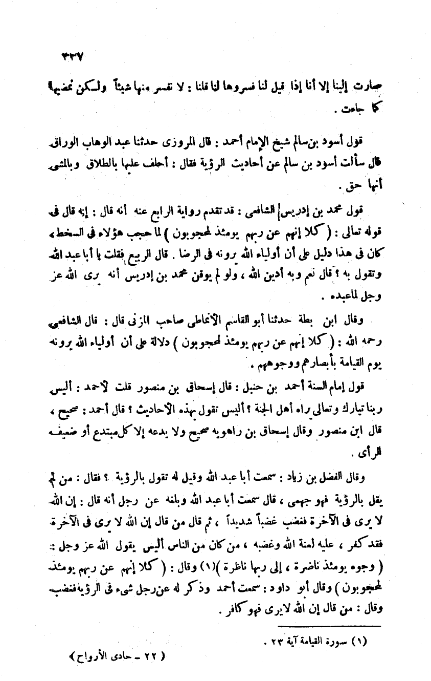 صارت إلينا إلا أنا إذا قيل لنا فسروها لنا قلنا لا نفسر منها شيئا ولكن نمضيها كما جاءت قول اسود بن سالم شيخ الإمام احمد قال المروزي حدثنا عبد الوهاب الوراق قال سألت اسود بن سالم عن أحاديث الرؤية فقال احلف عليها بالطلاق وبالمشي إنها حق قول محمد ابن إدريس الشافعي قد تقدم رواية الربيع عنه أنه قال في قوله تعالى: {كَلا إِنَّهُمْ عَنْ رَبِّهِمْ يَوْمَئِذٍ لَمَحْجُوبُونَ} لما حجب هؤلاء في السخط كان في هذا دليل على أن أولياءه يرونه في الرضا قال الربيع فقلب يا أبا عبد الله ونقول به قال نعم وبه ابن الله ولو لم يوقن محمد بن إدريس أنه يرى الله عز وجل لما عبده وقال ابن بطة حدثنا ابن الأنباري حدثنا أبو القاسم الأنماطي صاحب المزني قال قال الشافعي رحمه الله {كَلا إِنَّهُمْ عَنْ رَبِّهِمْ يَوْمَئِذٍ لَمَحْجُوبُونَ} دلالة على إن أولياء الله يرونه يوم القيامة بأبصارهم ووجوههم قول إمام السنة احمد بن حنبل قال إسحاق بن منصور قلت لأحمد أليس ربنا تبارك وتعالى يراه أهل الجنة أليس تقول بهذه الأحاديث قال احمد صحيح قال ابن منصور وقال إسحاق بن راهويه صحيح ولا يدعه إلا كل مبتدع أو ضعيف الرأي وقال الفضل بن زياد سمعت أبا عبد الله وقيل له تقول بالرؤية فقال من لم يقل بالرؤية فهو جهمي قال سمعت أبا عبد الله وبلغه عن رجل أنه قال إن الله لا يرى في الآخرة فغضب غضبا شديدا ثم قال من قال إن الله لا يرى في الآخرة فقد كفر عليه لعنة الله وغضبه من كان من الناس أليس يقول الله عز وجل {وُجُوهٌ يَوْمَئِذٍ نَاضِرَةٌ إِلَى رَبِّهَا نَاظِرَةٌ} وقال {كَلا إِنَّهُمْ عَنْ رَبِّهِمْ يَوْمَئِذٍ لَمَحْجُوبُونَ} وقال أبو داود سمعت احمد وذكر له عن رجل شيء في الرؤية فغضب وقال من قال إن الله لا يرى فهو كافر
