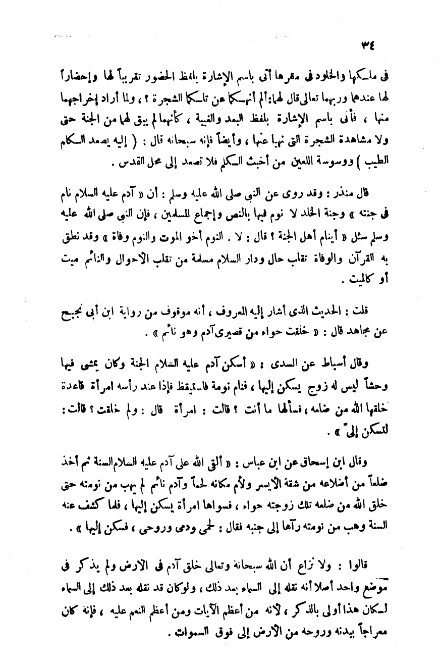 قال منذر وقد روي عن النبي صلى الله عليه وسلم" أن آدم عليه السلام نام في جنته" وجنة الخلد لا نوم فيها بالنص وإجماع المسلمين فإن النبي صلى الله عليه وسلم سئل أينام أهل الجنة قال: " لا النوم أخو الموت والنوم وفاة " وقد نطق به القرآن والوفاة تقلب حال ودار السلام مسلمة من تقلب الأحوال والنائم ميت أو كالميت.