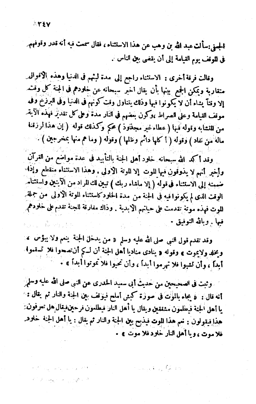 الجعفي سألت عبد الله بن وهب عن هذا الاستثناء فقال سمعت فيه أنه قدر وقوفهم في الموقف يوم القيامة إلى أن يقضي بين الناس وقالت فرقة أخرى الاستثناء راجع إلى مدة لبثهم في الدنيا وهذه الأقوال متقاربة ويمكن الجمع بينها بان يقال اخبر سبحانه وعن خلودهم في الجنة كل وقت إلا وقتا يشاء ان لا يكونوا فيها وذلك يتناول وقت كونهم في الدنيا وفي البرزخ وفي موقف يوم القيامة وعلى الصراط وكون بعضهم في النار مدة وعلى كل تقدير فهذه الآية من المتشابه وقوله فيها {عَطَاءً غَيْرَ مَجْذُوذٍ} محكم وكذلك قوله وما هم منها وقوله أن هذا لرزقنا ما له من نفاد وقوله {أُكُلُهَا دَائِمٌ وَظِلُّهَا} وقوله دمائهم منها بخرجين وقد أكد الله سبحانه وتعالى خلود أهل الجنة بالتأبيد في عدة مواضع من القران واخبر أنهما لا يذوقون فيها الموت إلا الموتة الأولى وهذا الاستثناء منقطع وإذا ضممته إلى الاستثناء في قوله إلا ما شاء ربك تبين لك المراد من الآيتين واستثناء الوقت الذي لم يكونوا فيه في الجنة من مدة الخلود كاستثناء الموتة الأولى من جملة الموت فهذه موتة تقدمت على حياتهم الأبدية وذاك مفارقة للجنة تقدم على خلودهم فيها وبالله التوفيق وقد تقدم قول النبي صلى الله عليه وسلم من يدخل الجنة ينعم ولا يبؤس ويخلد ولا يموت وقوله ينادي مناد يا أهل الجنة إن لكم أن تصحوا فلا تسقموا أبدا وان تشبوا فلا تهرموا أبدا وان تحيوا فلا تموتوا أبدا وثبت في الصحيحين من حديث أبي سعيد الخدري عن النبي صلى الله عليه وسلم أنه قال يجاء بالموت في صورة كبش املح فيوقف بين الجنة والنار ثم يقال يا أهل الجنة فيطلعون مشفقين ويقال يا أهل النار فيطلعون فرحين فيقال هل تعرفون هذا فيقولون نعم هذا الموت فيذبح بين الجنة والنار ثم يقال يا أهل الجنة خلود فلا موت ويا أهل النار خلود فلا موت"