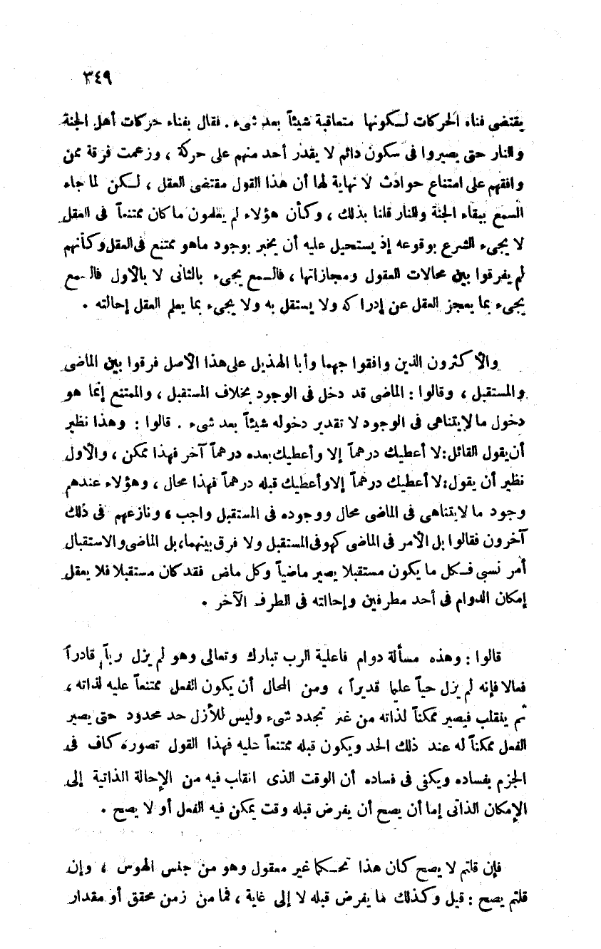 يقتضي فناء الحركات لكونها متعاقبة شيئا بعد شيء فقال بفناء حركات أهل الجنة والنار حتى يصيروا في سكون دائم لا يقدر احد منهم على حركة وزعمت فرقة ممن وافقهم على امتناع حوادث لا نهاية لها أن هذا القول مقتضى العقل لكن لما جاء السمع ببقاء الجنة والنار قلنا بذلك وكان هؤلاء لم يعلموا أن ما كان ممتنعا في العقل لا يجيء في الشرع بوقوعه إذ يستحيل عليه أن يخبر بوجود ما هو ممتنع في العقل وكأنهم لم يفرقوا بين محالات العقول ومجازاتها فالسمع يجيء بالثاني لا بالأول فالسمع يجيء بما يعجز العقل عن إدراكه ولا يستقل به ولا يجيء بما لا يعلم العقل أحالته والأكثرون الذين وافقوا جهما وأبا الهذيل على هذا الأصل فرقوا بين الماضي والمستقبل وقالوا الماضي قد دخل في الوجود بخلاف المستقبل والممتنع إنما هو دخول ما لا يتناهى في الوجود لا تقدير دخوله شيئا بعد شيء قالوا أو هذا نظيران يقول القائل لا أعطيك درهما إلا وأعطيتك بعده درهما آخر فهذا ممكن والأول نظير أن يقول لا أعطيك درهما إلا وأعطيك قبله درهما فهذا محال وهؤلاء عندهم وجود ما لا يتناهى في الماضي محال ووجوده في المستقبل واجب ونازعهم في ذلك آخرون فقالوا بل الأمر في الماضي كما هو في المستقبل ولا فرق بينهما بل الماضي والاستقبال أمر نسبي فكل ما يكون مستقبلا يصير ماضيا وكل ماض فقد كان مستقبلا فلا يعقل إمكان الدوام في أحد الطرفين وإحالته في الطرف الآخر قالوا وهذه مسألة دوام فاعلية الرب تبارك وتعالى وهو لم يزل ربا قادرا فاعل فانه لم يزل حيا عليما قديرا ومن المحال أن يكون الفعل ممتنعا عليه لذاته ثم ينقلب فيصير ممكنا لذاته من غير تجدد شيء وليس للأزل حد محدود حتى يصير الفعل ممكنا له عند ذلك الحد ويكون قبله ممتنعا عليه فهذا القول تصوره كاف في الجزم بفساده ويكفي في فساده أن الوقت الذي انقلب فيه الفعل من الإحالة الذاتيه إلى الأماكن الذات إما أن يصح أن يفرض قبله وقت يمكن فيه الفعل أولا لا يصح فان قلتم لا يصح كان هذا تحكما غير معقول وهو من جنس الهوس وان قلتم يصح قيل وكذلك ما يفرض قبله لا إلى غاية فما من زمن محقق أو مقدر