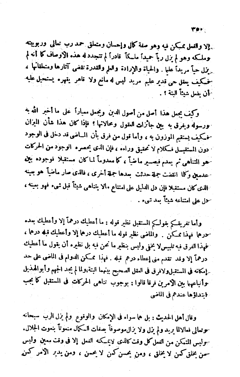 إلا والفعل مكن فيه وهو صفة كمال وإحسان ومتعلق حمد الرب وتعالى وربوبيته وملكه وهو لم يزل ربا حميدا ملكا قادرا لم تتجدد له هذه الأوصاف كما أنه لم يزل حيا مريدا عليما والحياة والإرادة والعلم والقدرة تقتضي آثارها ومتعلقاتها فكيف يعقل حي قدير عليم مريد ليس له مانع ولا قاهر يقهره يستحيل عليه أن يفعل شيئا ألبتة وكيف يجعل هذا اصل من أصول الدين ويجعل معيارا على ما اخبر الله به ورسوله ويفرق به بين جائزات العقول ومحالاتها فإذا كان وهذا شان الميزان فكيف يستقيم الموزون به وأما قول من فرق بان الماضي قد دخل في الوجود دون المستقبل فكلام لا تحقيق وراءه فان الذي يحصره الوجود من الحركات هو المتناهي ثم يعدم فيصير ماضيا كما كان معدوما لما كان مستقبلا فوجوده بين عدمين وكلما انقضت جملة حدثت بعدها جملة أخرى فالذي صار ماضيا هو بعينه الذي كان مستقبلا فان دل الدليل على امتناع ما لا يتناهى شيئا قبل شيء فهو بعينه دال على امتناعه شيئا بعد شيء وأما تفريقكم بقولكم المستقبل نظير قوله ما أعطيك درهما إلا وأعطيك بعده درهما فهذا ممكن والماضي نظير قوله ما أعطيك درهما إلا وأعطيك قبله درهما فهذا الفرق فيه تلبيس لا يخفى وليس بنظير ما نحن فيه بل نظيره ان يقول ما أعطيك درهما إلا وقد تقدم مني أعطاء درهم قبله فهذا ممكن الدوام في الماضي على حد إمكانه في المستقبل ولا فرق في العقل الصحيح بينهما البتة ولما لم يجد الجهم وأبو الهذيل واتباعهما بين الأمرين فرقا قالوا بوجوب تناهي الحركات في المستقبل كما يجب ابتداؤها عندهم في الماضي