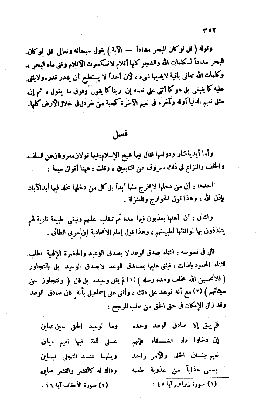 وقوله: {قُلْ لَوْ كَانَ الْبَحْرُ مِدَاداً} الآية يقول سبحانه وتعالى قل لو كان البحر مدادا لكلمات الله والشجر كلها أقلام لانكسرت الأقلام وفني ماء البحر وكلمات الله تعالى باقية لا يفنيها شيء لان أحدا لا يستطيع أن يقدر قدره ولا يثني عليه كما ينبغي بل هو كما أثنى على نفسه إن ربنا كما يقول وفوق ما يقول ثم إن مثل نعيم الدنيا أوله وآخره وفي نعيم الآخرة كحبة من خردل في خلال الأرض كلها فصل وأما أبدية النار ودوامها فقال فيها شيخ الإسلام فيها قولان معروفان عن السلف والخلف والنزاع في ذلك معروف عن التابعين قلت هاهنا أقوال سبعة احدها ان من دخلها لا يخرج منها أبدا بل كل من دخلها مخلد فيها أبد الآباد بإذن الله وهذا قول الخوارج والمعتزلة والثاني أن أهلها يعذبون فيها مدة ثم تنقلب عليهم وتبقى طبيعة نارية لهم يتلذذون بها لموافقتها لطبيعتهم وهذا قول إمام الاتحادية ابن عربي الطائي قال في فصوصه الثناء بصدق الوعد لا بصدق الوعيد والحضرة الإلهية تطلب الثناء المحمود بالذات فيثني عليها بصدق الوعد لا بصدق الوعيد بل بالتجاوز فلا تحسبن الله مخلف وعده رسله ولم يقل وعيده بل قال ويتجاوز عن سيئاتهم مع أنه توعد على ذلك وأثنى على اسماعيل بانه كان صادق الوعد وقد زال الامكان في حق الحق لما فيه من طلب المرجح