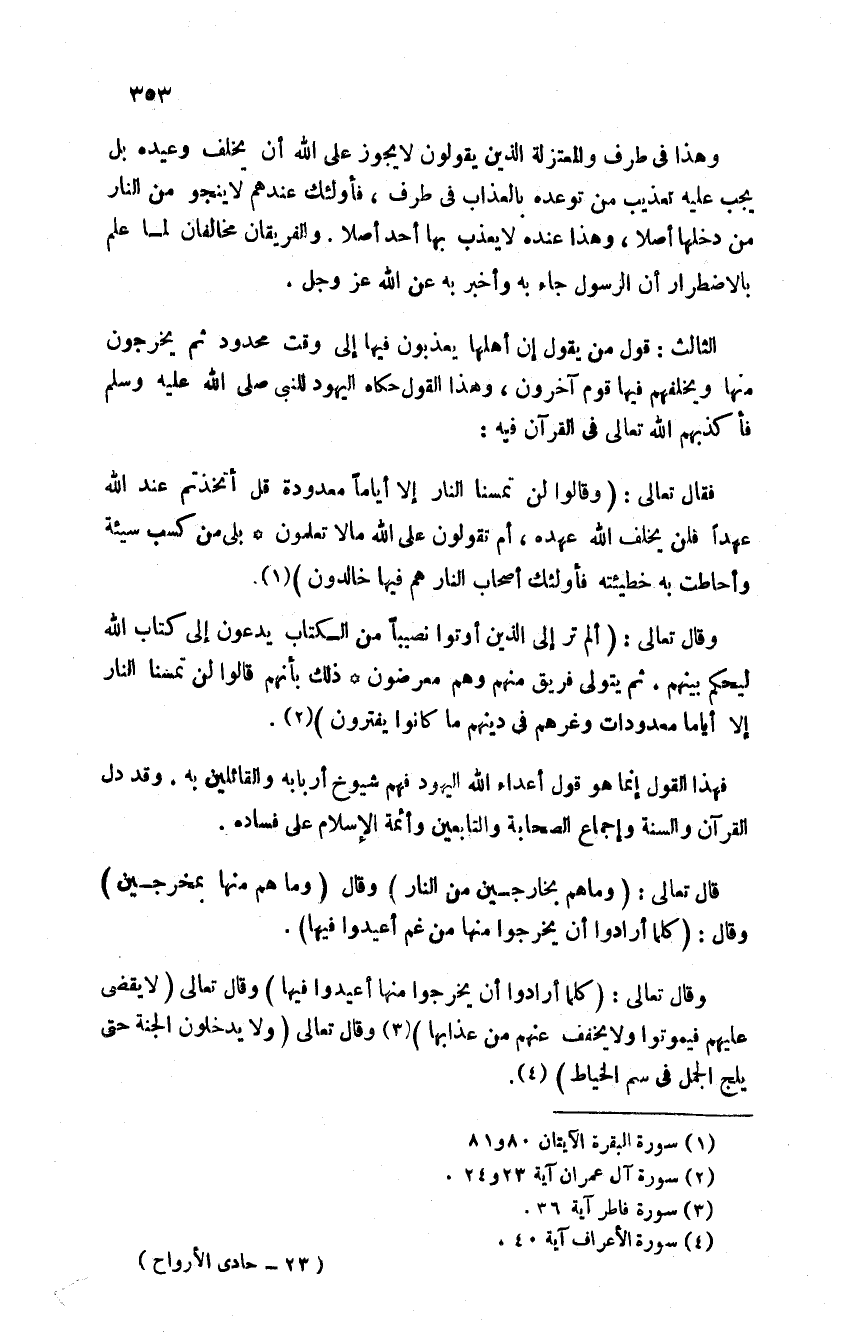 وهذا في طرف والمعتزلة الذين يقولون لا يجوز على الله أن يخلف وعيده بل يجب عليه تعذيب من توعده بالعذاب في طرف فأولئك عندهم لا ينجو من النار من دخلها أصلا وهذا عنده لا يعذب بها أحد أصلا والفريقان مخالفان لما علم بالاضطرار إن الرسول جاء به واخبر به عن الله عز وجل الثالث قول من يقول إن أهلها يعذبون فيها إلى وقت محدود ثم يخرجون منها ويخلفهم فيها قوم آخرون وهذا القول حكاه اليهود للنبي فأكذبهم فيه وقد أكذبهم الله تعالى في القرآن فيه فقال تعالى: {وَقَالُوا لَنْ تَمَسَّنَا النَّارُ إِلا أَيَّاماً مَعْدُودَةً قُلْ أَتَّخَذْتُمْ عِنْدَ اللَّهِ عَهْداً فَلَنْ يُخْلِفَ اللَّهُ عَهْدَهُ أَمْ تَقُولُونَ عَلَى اللَّهِ مَا لا تَعْلَمُونَ} وقال تعالى: {أَلَمْ تَرَ إِلَى الَّذِينَ أُوتُوا نَصِيباً مِنَ الْكِتَابِ} يدعون إلى كتاب الله ليحكم بينهم ثم يتولى فريق منهم وهم معرضون ذلك بأنهم قالوا لن تمسنا النار إلا أياما معدودات وغرهم في دينهم ما كانوا يفترون فهذا القول إنما هو قول أعداء الله اليهود فهم شيوخ أر بابه والقائلين به وقد دل القران والسنة وإجماع الصحابة والتابعين وأئمة الإسلام على فساده قال تعالى: {وَمَا هُمْ بِخَارِجِينَ مِنَ النَّارِ} وقال {وَمَا هُمْ بِخَارِجِينَ} وقال {كُلَّمَا أَرَادُوا أَنْ يَخْرُجُوا مِنْهَا مِنْ غَمٍّ أُعِيدُوا فِيهَا} وقال تعالى: كلما أرادوا أن يخرجوا منها أعيدوا فيها وقال تعالى: {لاَ يُقْضَى عَلَيْهِمْ فَيَمُوتُوا وَلا يُخَفَّفُ عَنْهُمْ مِنْ عَذَابِهَ} وقال تعالى: {وَلا يَدْخُلُونَ الْجَنَّةَ حَتَّى يَلِجَ الْجَمَلُ فِي سَمِّ الْخِيَاطِ}