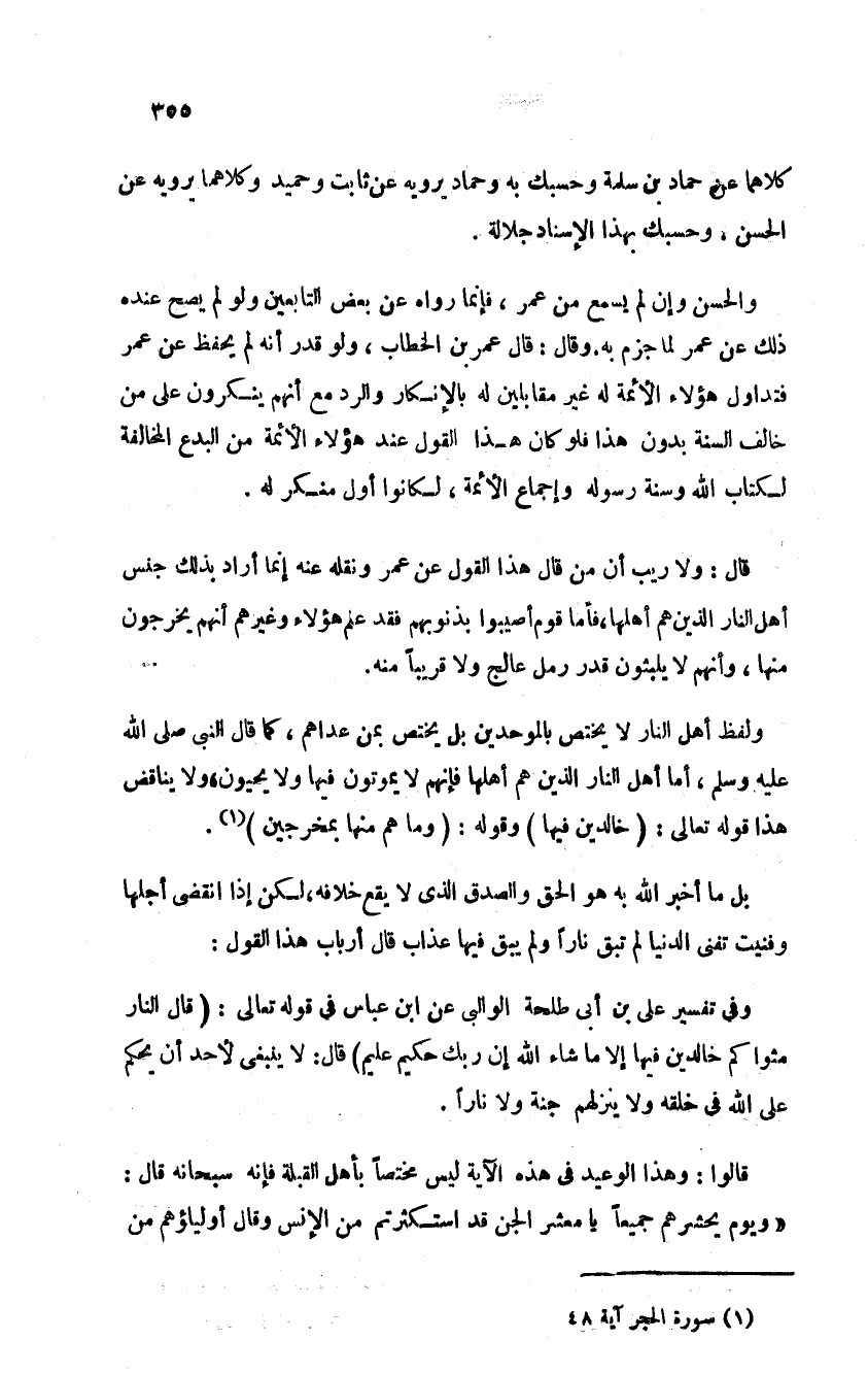 وكلاهما عن حماد بن سلمة وحسبك به وحماد يرويه عن ثابت وحميد وكلاهما يرويه عن الحسن وحسبك بهذا الإسناد جلالة والحسن وإن لم يسمع من عمر فإنما رواه عن بعض التابعين ولو لم يصح عنده ذلك عن عمر لما جزم به وقال عمر بن الخطاب ولو قدر أنه لم يحفظ عن عمر فتداول هؤلاء الأئمة له غير مقابلين له بالإنكار والرد مع أنهم ينكرون على من خالف السنة بدون هذا فلو كان خذا القول عند هؤلاء الأئمة من البدع المخالفة لكتاب الله وسنة رسوله وإجماع الأئمة لكانوا أول منكر له قال ولا ريب أن من قال هذا القول عن عمر ونقله عنه إنما أراد بذلك جنس أهل النار الذين هم أهلها فأما قوم أصيبوا بذنوبهم فقد علم هؤلاء وغيرهم أنهم يخرجون منها وأنهم لا يلبثون قدر رمل عالج ولا قريبا منه ولفظ أهل النار لا يختص بالموحدين بل يختص بمن عداهم كما قال النبي صلى الله عليه وسلم أما أهل النار الذين هم أهلها فإنهم لا يموتون فيها ولا يحيون ولا يناقض هذا قوله تعالى: {خَالِدِينَ فِيهَا} وقوله {وَمَا هُمْ مِنْهَا بِمُخْرَجِينَ} بل ما أخبر الله به هو الحق والصدق الذي لا يقع خلافه لكن إذا انقضى اجلها وفنيت تفنى الدنيا لم تبق نارا ولم يبق فيها عذاب قال أرباب هذا القول وفي تفسير علي بن أبي طلحة الوالبي عن ابن عباس في قوله تعالى: {قَالَ النَّارُ مَثْوَاكُمْ خَالِدِينَ فِيهَا إِلَّا مَا شَاءَ اللَّهُ إِنَّ رَبَّكَ حَكِيمٌ عَلِيمٌ} قال لا ينبغي لأحد أن يحكم على الله في خلقه ولا ينزلهم جنة ولا نارا قالوا وهذا الوعيد في هذه الآية ليس مختصا بأهل القبلة فانه سبحانه: {وَيَوْمَ يَحْشُرُهُمْ جَمِيعاً يَا مَعْشَرَ الْجِنِّ قَدِ اسْتَكْثَرْتُمْ مِنَ الأِنْسِ وَقَالَ أَوْلِيَاؤُهُمْ مِنَ