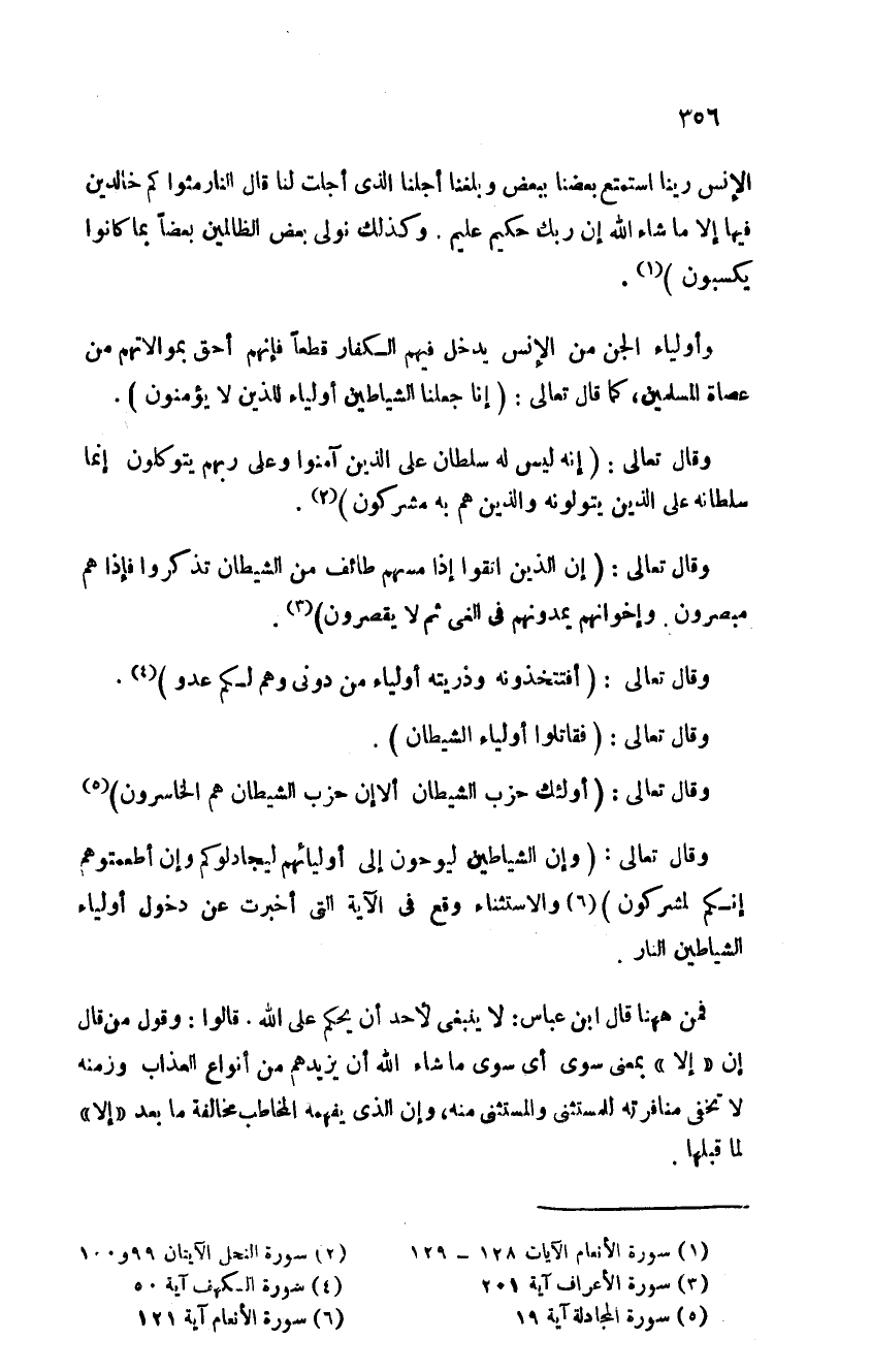 الأِنْسِ رَبَّنَا اسْتَمْتَعَ بَعْضُنَا بِبَعْضٍ وَبَلَغْنَا أَجَلَنَا الَّذِي أَجَّلْتَ لَنَا قَالَ النَّارُ مَثْوَاكُمْ خَالِدِينَ فِيهَا إِلَّا مَا شَاءَ اللَّهُ إِنَّ رَبَّكَ حَكِيمٌ عَلِيمٌ} وكذلك نولى بعض الظالمين بعضا بما كانوا يكسبون وأولياء الجن من الإنس يدخل فيه الكفار قطعا فإنهم أحق بموالاتهم من عصاة المسلمين كما قال تعالى: {إِنَّا جَعَلْنَا الشَّيَاطِينَ أَوْلِيَاءَ لِلَّذِينَ لا يُؤْمِنُونَ} وقال تعالى: {إِنَّهُ لَيْسَ لَهُ سُلْطَانٌ عَلَى الَّذِينَ آمَنُوا وَعَلَى رَبِّهِمْ يَتَوَكَّلُونَ إِنَّمَا سُلْطَانُهُ عَلَى الَّذِينَ يَتَوَلَّوْنَهُ وَالَّذِينَ هُمْ بِهِ مُشْرِكُونَ} وقال تعالى: {إِنَّ الَّذِينَ اتَّقَوْا إِذَا مَسَّهُمْ طَائِفٌ مِنَ الشَّيْطَانِ تَذَكَّرُوا فَإِذَا هُمْ مُبْصِرُونَ وَإِخْوَانُهُمْ يَمُدُّونَهُمْ فِي الْغَيِّ ثُمَّ لا يُقْصِرُونَ} وقال تعالى: {أَفَتَتَّخِذُونَهُ وَذُرِّيَّتَهُ أَوْلِيَاءَ مِنْ دُونِي وَهُمْ لَكُمْ عَدُوٌّ} وقال تعالى: {فَقَاتِلُوا أَوْلِيَاءَ الشَّيْطَانِ} وقال تعالى: {أُولَئِكَ حِزْبُ الشَّيْطَانِ أَلا إِنَّ حِزْبَ الشَّيْطَانِ هُمُ الْخَاسِرُونَ} وقال تعالى: {وَإِنَّ الشَّيَاطِينَ لَيُوحُونَ إِلَى أَوْلِيَائِهِمْ لِيُجَادِلُوكُمْ وَإِنْ أَطَعْتُمُوهُمْ إِنَّكُمْ لَمُشْرِكُونَ} والاستثناء وقع في الآية التي أخبرت عن دخول أولياء الشياطين النار