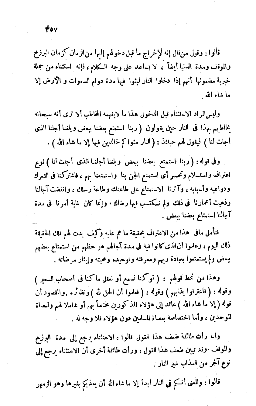 قالوا وقول من قال أنه لإخراج ما قبل دخولهم إليها من الزمان كزمان البرزخ والموقف ومدة الدنيا أيضا لا يساعد عليه وجه الكلام فانه استثناء من جملة خبرية مضمونها أنهم إذا دخلوا النار لبثوا فيها مدة دوام السماوات والأرض إلا ما شاء الله وليس المراد الاستثناء قبل الدخول هذا ما لا يفهمه المخاطب ألا ترى أنه سبحانه يخاطبهم بهذا في النار حين يقولون ربنا استمتع بعضنا ببعض وبلغنا أجلنا الذي أجلت لنا فيقول لهم حينئذ النار مثواكم خالدين فيها إلا ما شاء الله وفي قوله ربنا استمتع بعضنا ببعض وبلغنا أجلنا الذي أجلت لنا نوع اعتراف واستسلام وتحسر أي استمتع الجن بنا واستمتعنا بهم فاشتركنا في الشرك ودواعيه وأسبابه وآثرنا الاستمتاع على طاعتك وطاعة رسلك وانقضت آجالنا وذهبت أعمارنا في ذلك ولم نكتسب فيها رضاك وإنما كان غاية امرنا في مدة آجالنا استمتاع بعضنا ببعض فتأمل ما في هذا القول من الاعتراف بحقيقة ما هم عليه وكيف بدت لهم تلك الحقيقة ذلك اليوم وعلموا أن الذي كانوا فيه في مدة آجالهم هو حظهم من استمتاع بعضهم ببعض ولم يستمتعوا بعبادة ربهم ومعرفته وتوحيده ومحبته وإيثار مرضاته وهذا من نمط قولهم لو كنا نسمع أو نعقل ما كنا في أصحاب السعير وقوله فاعترفوا بذنبهم وقوله فعلموا أن الحق لله ونظائرة والمقصود أن قوله إلا ما شاء الله عائد إلى هؤلاء المذكورين مختصا بهم أو شاملا لهم ولعصاة الموحدين وأما اختصاصه بعصاة المسلمين دون هؤلاء فلا وجه له ولما رأت طائفة ضعف هذا القول قالوا الاستثناء يرجع إلى مدة البرزخ والموقف وقد تبين ضعف هذا القول ورأت طائفة أخرى أن الاستثناء يرجع إلى نوع آخر من العذاب غير النار