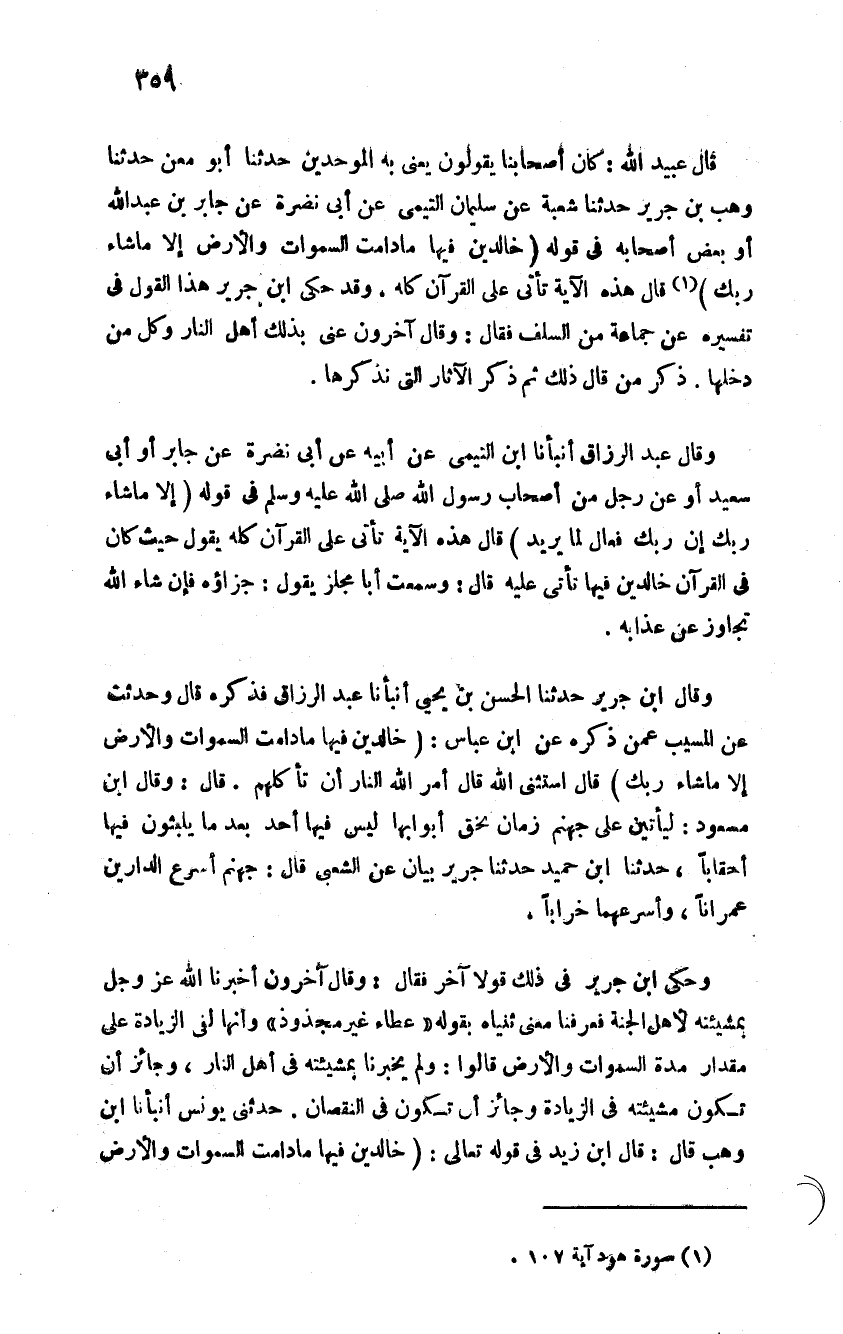 قال عبيد الله كان أصحابنا يقولون يعني به الموحدين حدثنا أبو معن حدثنا وهب بن جرير حدثنا شعبة عن سليمان التيمي عن أبي نضرة عن جابر ابن عبد الله أو بعض أصحابه في قوله خالدين فيها ما دامت السماوات والأرض إلا ما شاء ربك قال هذه الآية تأتي على القران كله وقد حكى ابن جرير هذا القول في تفسيره عن جماعة من السلف فقال وقال آخرون عنى بذلك أهل النار وكل من دخلها ذكر من قال ذلك ثم ذكر الآثار التي نذكرها وقال عبد الرزاق أنبانا ابن التيمي عن أبيه عن أبي نضرة عن جابر أو أبي سعيد أو عن رجل من أصحاب رسول الله في قوله إلا ما شاء ربك أن ربك فعال لما يريد قال هذه الآية تأتي على القران كله يقول حيث كان في القران خالدين فيها تأتي عليه قال وسمعت أبا مجلز يقول جزاؤه فان شاء الله تجاوز عن عذابه وقال ابن جرير حدثنا الحسن بن يحيى أنبانا عبد الرزاق فذكره وقال وحدثت عن المسيّب عمن ذكره عن ابن عباس: {خَالِدِينَ فِيهَا مَا دَامَتِ السَّمَاوَاتُ وَالأَرْضُ إِلا مَا شَاءَ رَبُّكَ} قال: لا يموتون وما هم منها بمخرجين ما دامت السماوات والأرض إلا ما شاء ربك قال استثنى الله قال أمر الله النار أن تأكلهم قال وقال ابن مسعود ليأتين على جهنم زمان تخفق أبوابها ليس فيها أحد بعد ما يلبثون فيها أحقابا حدثنا ابن حميد حدثنا جرير عن بيان عن الشعبي قال جهنم أسرع الدارين عمرانا وأسرعهما خرابا وحكى ابن جرير في ذلك قولا آخر فقال وقال آخرون اخبرنا الله عز وجل بمشيئته لأهل الجنة فعرفنا معنى ثنياه بقوله عطاء غير مجذوذ وأنها لفي الزيادة على مقدار مدة السماوات والأرض قالوا ولم يخبرنا بمشيئته في أهل النار وجائز أن يكون مشيئته في الزيادة وجائز أن تكون في النقصان حدثني يونس أنبانا ابن وهب قال اقل ابن زيد في قوله تعالى: {خَالِدِينَ فِيهَا مَا دَامَتِ السَّمَاوَاتُ وَالأَرْضُ