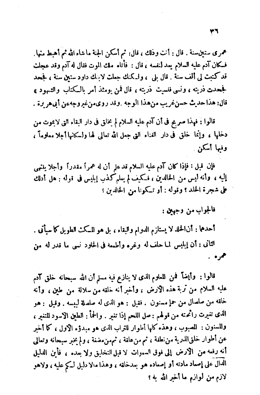 قالوا وأيضا فمن المعلوم الذي لا ينازع فيه مسلم أن الله سبحانه خلق آدم عليه السلام من تربة هذه الأرض وأخبر أنه خلقه من سلالة من طين وأنه خلقه من صلصال من حمأ مسنون فقيل هو الذي له صلصلة ليبسة وقيل هو الذي تغيرت رائحته من قولهم صل اللحم إذا تغير والحمأ الطين الأسود المتغير والمسنون المصبوب وهذه كلها أطوار للتراب الذي هو مبدؤه الأول كما أخبر عن أطوار خلق الذرية من نطفة ثم من علقة ثم من مضغة ولم يخبر سبحانه وتعالى أنه رفعه من الأرض إلى فوق السماوات لا قبل التخليق ولا بعده فأين الدليل الدال على إصعاد مادته أو إصعاده هو بعد خلقه وهذا ما لا دليل لكم عليه ولا هو لازم من لوازم ما أخبر الله به؟