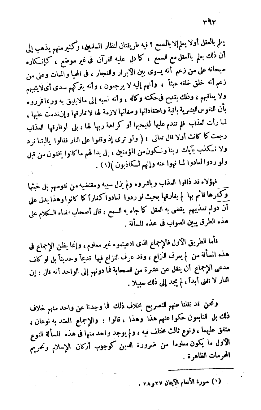 يعلم بالعقل أو لا يعلم إلا بالسمع فيه طريقتان لنظار المسلمين وكثير منهم يذهب إلى أن ذلك يعلم بالعقل مع السمع كما دل عليه القران في غير موضع كإنكاره سبحانه على من زعم أنه يسوى بن الأبرار والفجار في المحيا والممات وعلى من زعم أنه خلق خلقه عبثا وأنهم إليها لا يرجعون وأنه يتركهم سدى أي لا يثيبهم ولا يعاقبهم وذلك يقدح في حكمته وكماله وانه نسبه إلى ما لا يليق به وربما قرروه بان النفوس البشرية باقية واعتقاداتها وصفاتها لازمة لها لا تفارقها وأن ندمت عليها لما رأت العذاب فلم تندم عليها لقبحها أو كراهة ربها لها بل لو فارقها العذاب رجعت كما كانت أولا قال تعالى: {وَلَوْ تَرَى إِذْ وُقِفُوا عَلَى النَّارِ فَقَالُوا يَا لَيْتَنَا نُرَدُّ وَلا نُكَذِّبَ بِآيَاتِ رَبِّنَا وَنَكُونَ مِنَ الْمُؤْمِنِينَ بَلْ بَدَا لَهُمْ مَا كَانُوا يُخْفُونَ مِنْ قَبْلُ وَلَوْ رُدُّوا لَعَادُوا لِمَا نُهُوا عَنْهُ وَإِنَّهُمْ لَكَاذِبُونَ} فهؤلاء قد ذاقوا العذاب وباشروه ولم يزل سببه ومقتضيه من نفوسهم بل خبثها وكفرها قائم بها لم يفارقها بحيث لو ردوا لعادوا كفارا كما كانوا وهذا يدل على أن دوام تعذيبهم يقضى به العقل كما جاء به السمع قال أصحاب الفناء الكلام على هذه الطرق يبين الصواب في هذه المسالة فأما الطريق الأول فالإجماع الذي ادعيتموه غير معلوم وإنما يظن الإجماع في هذه المسالة من لم يعرف النزاع وقد عرف النزاع فيها قديما وحديثا بل لو كلف مدعي الإجماع أن ينقل عن عشرة من الصحابة فما دونهم إلى الواحد أنه قال إن النار لا تفنى أبدا لم يجد إلى ذلك سبيلا ونحن قد نقلنا عنهم التصريح بخلاف ذلك فما وجدنا عن واحد منهم خلاف ذلك بل التابعون حكوا عنهم هذا وهذا قالوا والإجماع المعتد به نوعان متفق عليهما ونوع ثالث مختلف فيه ولم يوجد واحد منها في هذه المسالة النوع الأول ما يكون معلوما من ضرورة الدين كوجوب أركان الإسلام وتحريم المحرمات الظاهرة