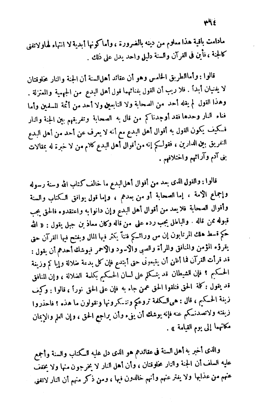 ما دامت باقية هذا معلوم من دينه بالضرورة وأما كونها أبدية لا انتهاء لها ولا تفنى كالجنة فأين من القران والسنة دليل واحد يدل على ذلك قالوا وأما الطريق الخامس وهو أن في عقائد أهل السنة أن الجنة والنار مخلوقتان لا يفنيان أبدا فلا ريب أن القول بفنائهما قول أهل البدع من الجهمية والمعتزلة وهذا القول لم يقله أحد من الصحابة ولا التابعين ولا أحد من أئمة المسلمين وأما فناء النار وحدها فقد أوجدنا كم من قال به من الصحابة وتفريقهم بين الجنة والنار فكيف يكون القول به من أقوال أهل البدع مع أنه لا يعرف عن أحد من أهل البدع التفريق بين الدارين فقولكم أنه من أقوال أهل البدع كلام من لا خبرة له بمقالات بني آدم وآرائهم واختلافهم قالوا والقول الذي يعد من أقوال أهل البدع ما خالف كتاب الله وسنة رسوله وإجماع الأمة أما الصحابة أو من بعدهم وأما قول يوافق الكتاب والسنة وأقوال الصحابة فلا يعد من أقوال أهل البدع وأن دانوا به واعتقدوه فالحق يجب قبوله ممن قاله والباطل يجب رده على من قاله وكان معاذ بن جبل يقول الله حكم قسط هلك المرتابون أن من ورائكم فتنا يكثر فيها المال ويفتح فيها القران حتى يقرؤه المؤمن والمنافق والمرآة والصبي والأسود والأحمر فيوشك أحدهم أن يقول قد قرأت القران فما أظن أن يتبعوني حتى ابتدع بدلهم غيره فإياكم وما ابتدع فان كل بدعة ضلالة وإياكم وزيغة الحكيم فان الشيطان قد يتكلم على لسان الحكيم بكلمة الضلالة وأن المنافق قد يقول كلمة الحق فتلقوا الحق عمن جاء به فان على الحق نورا قالوا وكيف زيغة الحكيم قال هي الكلمة تروعكم وتنكرونها وتقولون ما هذه فاحذروا زيغته ولا تصدنكم عنه فانه يوشك أن يفيء وأن يراجع الحق وأن العلم والإيمان مكانهما إلى يوم القيامة والذي اخبر به أهل السنة في عقائدهم هو الذي دل عليه الكتاب والسنة واجمع عليه السلف أن الجنة والنار مخلوقتان وأن أهل النار لا يخرجون منها ولا يخفف عنهم من عذابها العذاب ولا يفتر عنهم وأنهم خالدون فيها ومن ذكر منهم أن النار لا تفنى