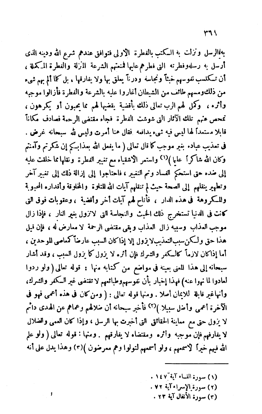 به الرسل ونزلت به الكتب بالفطرة الأولى فتوافق عندهم شرع الله ودينه الذي أرسل به رسله وفطرته التي فطرهم عليها فمنعتهم الشرعة المنزلة والفطرة المكملة أن تكتسب نفوسهم خبثا ونجاسة ودرنا يعلق بها ولا يفارقها بل كلما ألم بهم شيء من ذلك ومسهم طائف من الشيطان أغاروا عليه بالشرعة والفطرة فأزالوا موجبه وأثره وكمل لهم الرب تعالى ذلك بأقضية يقضيها لهم مما يحبون أو يكرهون تمحص عنهم تلك الآثار التي شوشت الفطرة فجاء مقتضى الرحمة فصادف مكانا قابلا مستعدا لها ليس فيه شيء يدافعه فقال ههنا أمرت وليس لله سبحانه غرض في تعذيب عباده بغير موجب كما قال تعالى: {مَا يَفْعَلُ اللَّهُ بِعَذَابِكُمْ إِنْ شَكَرْتُمْ وَآمَنْتُمْ وَكَانَ اللَّهُ شَاكِراً عَلِيماً} واستمر الأشقياء مع تغيير الفطرة ونقلها مما خلقت عليه إلى ضده حتى استحكم الفساد وتم التغيير فاحتاجوا في إزالة ذلك إلى تغيير آخر وتطهير ينقلهم إلى الصحة حيث لم تنقلهم آيات الله المتلوة والمخلوقة وأقداره المحبوبة والمكروهة في هذه الدار فأتاح لهم آيات آخر وأقضية وعقوبات فوق التي كانت في الدنيا تستخرج ذلك الخبث والنجاسة التي لا تزول بغير النار فإذا زال موجب العذاب وسببه زال العذاب وبقي مقتضى الرحمة لا معارض له فان قيل هذا حق ولكن سبب التعذيب لا يزول إلا إذا كان السبب عارضا كمعاصي الموحدين أما إذا كان لازما كالكفر والشرك فان أثره لا يزول كما لا يزول السبب وقد أشار سبحانه إلى هذه المعنى بعينه في مواضع من كتابه منها قوله تعالى: {وَلَوْ رُدُّوا لَعَادُوا لِمَا نُهُوا عَنْهُ} فهذا إخبار بان نفوسهم وطبائعهم لا تقتضي غير الكفر والشرك وإنها غير قابلة للإيمان أصلا ومنها قوله تعالى: {وَمَنْ كَانَ فِي هَذِهِ أَعْمَى فَهُوَ فِي الآخِرَةِ أَعْمَى وَأَضَلُّ سَبِيلاً} فاخبر سبحانه أن ضلالهم وعماهم عن الهدى دائم لا يزول حتى مع معاينة الحقائق التي أخبرت بها الرسل وإذا كان العمى والضلال لا يفارقهم فان موجبه وأثره ومقتضاه لا يفارقهم ومنها قوله تعالى: {وَلَوْ عَلِمَ اللَّهُ فِيهِمْ خَيْراً لأسْمَعَهُمْ وَلَوْ أَسْمَعَهُمْ لَتَوَلَّوْا وَهُمْ مُعْرِضُونَ} وهذا يدل على أنه
