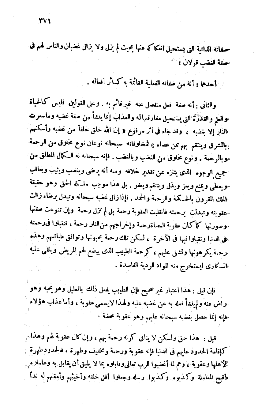 صفاته الذاتية التي يستحيل انفكاكه عنها بحيث لم يزل ولا يزال غضبان والناس لهم في صفة الغضب قولان أحدهما أنه من صفاته الفعلية القائمة به كسائر أفعاله والثاني أنه صفة فعل منفصل عنه غير قائم به وعلى القوانين فليس كالحياة والعلم والقدرة التي يستحيل مفارقتها له والعذاب إنما ينشا من صفة غضبه وما سعرت النار إلا بغضبه وقد جاء في اثر مرفوع أن الله خلق خلقا من غضبه وأسكنهم بالمشرق وينتقم بهم ممن عصاه فمخلوقاته سبحانه نوعان نوع مخلوق من الرحمة وبالرحمة ونوع مخلوق من الغضب وبالغضب فانه سبحانه له الكمال المطلق من جميع الوجوه الذي يتنزه عن تقدير خلافه ومنها أنه يرضى ويغضب ويثيب ويعاقب ويعطي ويمنع ويعز ويذل وينتقم ويعفو بل هذا موجب ملكه الحق وحقيقة الملك المقرون بالحكمة والرحمة والحمد فإذا زال غضبه سبحانه وتعالى وتبدل برضاه زالت عقوبته وتبدلت برحمته فانقلبت العقوبة إلى رحمة بل لم تزل رحمة وأن تنوعت صفتها وصورتها كما كان عقوبة العصاة رحمة وإخراجهم من النار رحمة فتقلبوا في رحمته في الدنيا وتقلبوا فيها في الآخرة لكن تلك الرحمة يحبونها وتوافق طبائعهم وهذه رحمة يكرهونها وتشق عليهم كرحمة الطبيب الذي يضع لحم المريض ويلقي عليه المكاوي ليستخرج منه المواد الرديئة الفاسدة فان قيل هذا اعتبار غير صحيح فان الطبيب يفعل ذلك بالعليل وهو يحبه وهو راض عنه ولم ينشا فعله به عن غضبه بغضبه عليه ولهذا لا يسمى عقوبة وأما عذاب هؤلاء فانه إنما حصل بغضبه سبحانه عليهم وهو عقوبة محضة قيل هذا حق ولكن لا ينافي كونه رحمة بهم وأن كان عقوبة لهم وهذا كإقامة الحدود عليهم في الدنيا فانه عقوبة ورحمة وتخفيف وطهرة فالحدود طهرة لأهلها وعقوبة وهم لما أغضبوا الرب تعالى وقابلوه بما لا يليق أن يقابل به وعاملوه أقبح المعاملة وكذبوه وكذبوا رسله وجعلوا اقل خلقه وأخبثهم وامقتهم له ندا