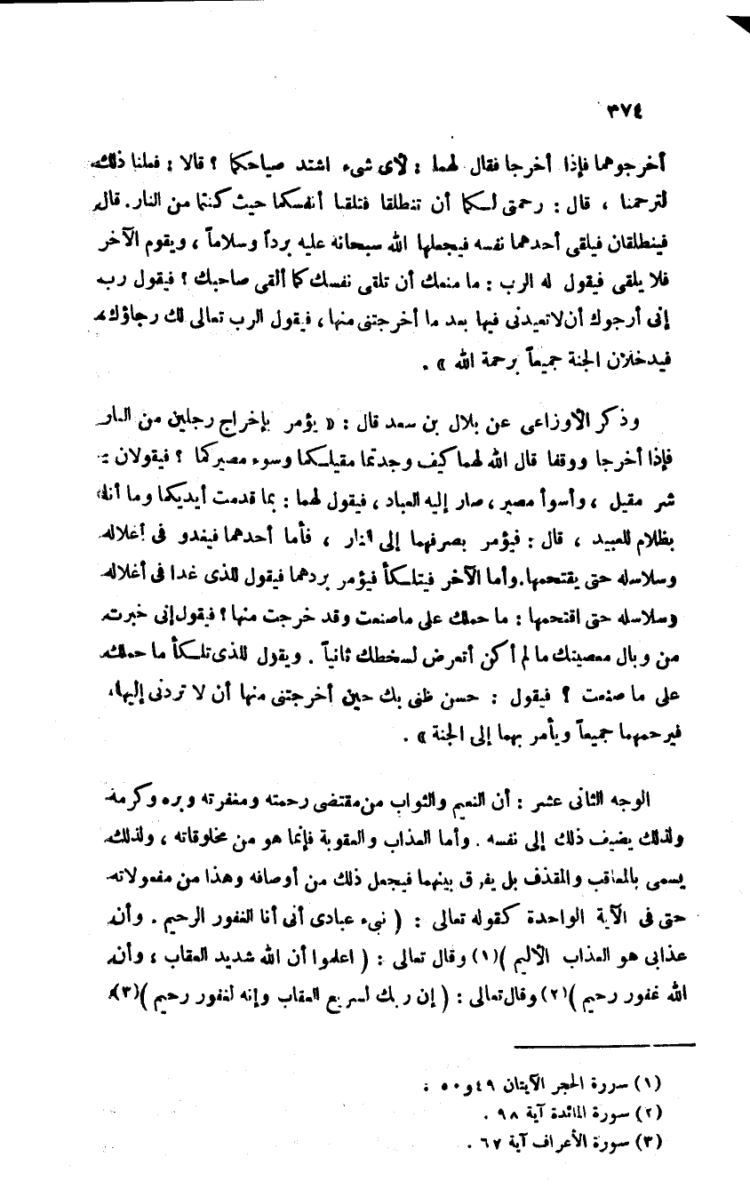 أخرجوهما فإذا أخرجا فقال لهما لأي شيء اشتد صياحكما قال فعلنا ذلك لترحمنا قال رحمتي لكما أن تنطلقا فتلقيا أنفسكما حيث كنتما من النار قال فينطلقان فيلقي أحدهما نفسه فيجعلها الله سبحانه عليه بردا وسلاما ويقوم الآخر فلا يلقي فيقول له الرب تبارك وتعالى ما منعك أن تلقي نفسك كما ألقى صاحبك فيقول رب إني أرجوك أن لا تعيدني فيها بعدما أخرجتني منها فيقول الرب وتعالى لك رجاؤك فيدخلان الجنة جميعا برحمة الله وذكر الأوزاعي عن بلال بن سعد قال يؤمر بإخراج رجلين من النار فإذا خرجا ووقفا قال الله لهما كيف وجدتما مقيلكما وسوء مصيركما فيقولان شر مقيل وأسوا مصير صار إليه العبد فيقول لهما بما قدمت أيديكما وما أنا بظلام للعبيد قال فيؤمر بصرفهما إلى النار فأما أحدهما فيغدوا في أغلاله وسلاسله حتى يقتحمها وأما الآخر فيتلكا فيؤمر بردهما فيقول للذي غدا في أغلاله وسلاسله حتى اقتحمها ما حملك على ما صنعت وقد خرجت منها فيقول إني خبرت من وبال معصيتك وما لم اكن أتعرض لسخطك ثانيا ويقول للذي تلكأ ما حملك على ما صنعت فيقول حسن ظني بك حين أخرجتني منها أن لا تردني إليها فيرحمهما جميعا ويأمر بهما إلى الجنة الوجه الثاني عشر أن النعيم والثواب من مقتضى رحمته ومغفرته وبره كرمه ولذلك يضيف ذلك إلى نفسه وأما العذاب والعقوبة فإنما هو من مخلوقاته ولذلك لا يسمى بالمعاقب والمعذب بل يفرق بينهما فيجعل ذلك من أوصافه وهذا من مفعولاته حتى في الآية الواحدة كقوله تعالى: {نَبِّئْ عِبَادِي أَنِّي أَنَا الْغَفُورُ الرَّحِيمُ وَأَنَّ عَذَابِي هُوَ الْعَذَابُ الأَلِيمُ} وقال: {اعْلَمُوا أَنَّ اللَّهَ شَدِيدُ الْعِقَابِ وَأَنَّ اللَّهَ غَفُورٌ رَحِيمٌ} {إِنَّ رَبَّكَ لَسَرِيعُ الْعِقَابِ وَإِنَّهُ لَغَفُورٌ رَحِيمٌ}