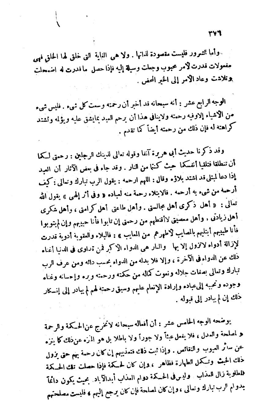يوضحه الوجه الخامس عشر إن أفعاله سبحانه لا تخرج عن الحكمة والرحمة والمصلحة والعدل فلا يفعل عبثا ولا جورا ولا باطلا بل هو المنزه عن ذلك كما ينزه عن سائر العيوب والنقائص وإذا ثبت ذلك فتعذيبهم إن كان رحمة بهم حتى يزول ذلك الخبث وتكمل الطهارة فظاهر وإن كان لحكمة فإذا حصلت تلك الحكمة المطلوبة زال العذاب وليس في الحكمة دوام العذاب أبدا الآباد بحيث يكون دائما بدوام الرب تبارك وتعالى وإن كان لمصلحة وإن كان لمصلحة فإن كان يرجع إليهم"فليست مصلحتهم